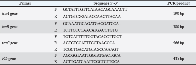 AbstractBackground: Staphylococcus aureus (S. aureus) is a major pathogenic bacterium in veterinary medicine and human health. It is one of the most important bacterial agents causing urinary tract infection (UTI). The increasing incidence of multidrug-resistant and biofilm-forming S. aureus is a great problem today. The aim of the study was to investigate the phenotypic and genotypic aspects of biofilm formation in multiple drug-resistant (MDR) S. aureus isolated from UTI infection in human and cattle in Babylon, Iraq. Methodology: A total of 168 and 172 urine samples were collected from UTI infection in humans and cattle, respectively, during the period from November 2023 to February 2024. Morphological and biochemical identification was used to diagnose S. aureus. Additional confirmation was performed by the automated Vitek 2 compact system. Results: Among the 168 human isolates, 24 (14.2%) and 172 cattle isolates, 16 (9.3%) isolates were diagnosed as S. aureus. Genotypically identification of the isolates was performed using the 16s RNA gene. Twenty-two (91.6%) from 24 human source S. aureus isolates and 8 (50%) from 16 animal source S. aureus isolates were found to be MDR according to the Vitek 2 compact system. Results revealed that 19 (86.3%) and 7(87.5%) MDR isolates were phenotypically positive for biofilm production in concern to human and animal source isolates, respectively. Genotypically, three polysaccharide intracellular adhesion genes and one MSCRAMMs (fib) were screened in MDR bacteria using specific primers. The prevalence rate of genes was icaA (100%), icaB (100%), and icaC (100%) in all 30 MDR isolates. fib gene were present in 63.6% of human isolates and 75% of cattle source isolates. Conclusion: The study has shown that the biofilm-forming S. aureus that causes UTI were resistant to multiple antibiotic agents. These findings underscore the necessity of development effective treatment approaches to control UTI infections in humans and animals. Keywords: Staphylococcus aureus, Vitek II, Biofilm genes, UTI infections. IntroductionUrinary tract infection (UTI) is the most common bacterial infection in hospital- and community-acquired infections (Tekin et al., 2012). Bacteria are considered the primary cause of UTI, followed by fungi and viruses which are sometimes considered as an uncommon phenomenon. UTI is not dangerous, but patients have many symptoms as the stage progresses may lead to death in severe cases (Parveen et al., 2011; Demilie et al., 2012). Staphylococcus aureus is supposed as one of the main pathogens in humans and animals (Sheet et al., 2021). It is one of the most important bacterial agents causing UTI because of the high distribution of this species in the hospital environment, high antibiotic resistance, and high resistance against extreme conditions (Tong et al., 2015). UTI sources in neonatal animals may be associated with ascending infection from the urachus, involving the kidney, bladder, and ureter. In bovine species, an additional possible pathway for this disease is through the vulva, which may play a main role as an entry site for numerous urinary pathogens. Furthermore, in cattle bacteremia, septic catheterization, and post-calving illnesses may be predisposing factors for UTI (Baxter, 1989). Worldwide, antimicrobial resistance is a growing and emerging public health problem (Olopade et al., 2023). Methicillin-resistant S. aureus (MRSA) can harm public health as they are resistant to multiple antibiotics (Sheet et al., 2023). The unselective antibiotic treatment increased the number of multiple drug-resistant (MDR) strains, which is considered a great challenge in UTI treatment (Farajzadah et al., 2019). In MDR bacteria, the pathogen is resistant to several chemotherapeutic agents and has acquired non-susceptibility to at least one agent in three or more (≤3) antimicrobial categories. This phenomenon increases the mortality and morbidity rates (Nikaido, 2009). Although methicillin has been used to eliminate resistant S. aureus, the development of MRSA isolates has restricted their efficiency (Sheet et al., 2023). The resistance to β-lactam antibiotics occurring in MRSA strains could be associated with the presence of transferable genomic islands, called SCCmec, in the bacterial genome, where the mecA gene determines resistance to methicillin. Within the different types of SCCmec, resistance genes to other classes of antibiotics like macrolides, lincosamide, aminoglycosides, tetracyclines (T), and streptogramin B (Mlynarczyk-Bonikowska et al., 2022). Moreover, the capability of S. aureus to produce biofilms assistance to the bacteria in the urinary tract for growth and persistence by providing a nutrient-rich environment and protecting it from host defense and antimicrobial agents (Kot et al., 2016). The important component of S. aureus biofilm is polysaccharides of intercellular adhesion (PIA), which is synthesis by icaADBC operon. The characterization of bacteria will enhance our understanding of their pathogenesis and aid in the development of effective therapeutic approaches for controlling UTI infections. Thus, our objective was to investigate the phenotypic and genotypic aspects of biofilm formation in MDR S. aureus isolated from UTI infection in human and cattle in Babylon, Iraq. Materials and MethodsSamples CollectionHumanUrine samples were collected in a clean container from 168 patients with UTI, representing both sexes and different age groups during the period from November 2023 to February 2024. A survey was made with patients to yield the full history of general information, such as age, clinical cases associated, and type of antibiotic administration. CattleThis study was carried out on 172 cattle of different ages and sexes from different regions in Babylon Governorate through a period from November 2023 to February 2024. The animals appeared clinically to be suffering from UTI based on the following symptoms: signs of pai