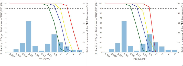 Fig. 4. PTA fAUC24/MIC ≥ 28.32 (top or left) and fAUC24/MIC ≥ 125 (down or right) for 10 (line green), 20 (line blue), 30 (line yellow), and 50 mg/kg (line red) of enrofloxacin administered via gavage in 10000 simulated broiler chickens. The horizontal black dotted line represents a PTA of 90%. Regarding the generalist index for fluoroquinolones against Gram-negative bacteria (fAUC24/MIC ≥ 125), the current dose of 10 mg/kg is predicted to be effective for bacteria up to a MIC of 0.06 µg/ml with a PTA of 95%. The simulated doses of 20 and 30 mg/kg are predicted to be effective for bacteria with MICs of up to 0.125 µg/ml and PTA of 94% and 99%, respectively. The highest dose of 50 mg/kg is predicted to be effective for bacteria with MICs of up to 0.5 µg/ml, with a PTA of 93%. DiscussionEnrofloxacin is one of the most commonly used antibiotics for treating respiratory and gastrointestinal tract diseases in broilers worldwide. However, fluoroquinolones are deemed critical by the WHO and should be used only in veterinary therapy after exhausting other potentially less critical antimicrobial agents [Food and Drug Administration (FDA), 2018; WHO, 2019]. Therefore, reconsidering the clinical breakpoint is crucial, as clinicians base their treatment protocols on the susceptibility of bacteria to antimicrobial susceptibility testing. Fluoroquinolones are significantly affected by increasing antimicrobial resistance, which could reduce the efficacy of treatments established with the doses recommended in the leaflet (Vanni et al., 2014; Temmerman et al., 2020). Therefore, regimen optimization is necessary to increase therapeutic success and decrease the emergence and spread of antimicrobial resistance (Mouton et al., 2011; Martinez et al., 2012). To characterize the MIC distribution of E. coli strains isolated from chickens, the present study compiled data from four previously published studies: Huang et al. (2009); Vanni et al. (2014); Sang et al. (2016) and Temmerman et al. (2020) comprising a total of 1,734 isolates from birds of different geographic and production backgrounds (Fig. 1). Based on the CLSI clinical breakpoints of enrofloxacin for E. coli strains from poultry, the isolates were classified as susceptible (S, MIC ≤0.25 µg/ml), susceptible with increased exposure (I, 0.5 ≥ MIC ≤ 1 µg/ml), or resistant (R, MIC ≥ 2 µg/ml) [Clinical and Laboratory Standards Institute (CLSI), 2024]. Notably, all four datasets exhibited a tendency toward a trimodal distribuition, with a progressive rightward shift observed in the most recent studies. This trend was particularly evident in the study by Sang et al. (2016) where 38% of isolates presented MICs between 1 and 64 µg/ml In contrast, Huang et al. (2009) reported that 88% of isolates had MIC values ≤0.25 µg/ml, with a prominent peak at 0.003 µg/ml (307/445 strains), and only 3% were classified as resistant (CLSI, 2024). These findings indicate a temporal increase in MIC values among E. coli isolates, indicating a gradual loss of enrofloxacin susceptibility. The resulting ECOFF was 0.125 µg/ml, consistent with the distributions reported by Vanni et al. (2014), Sang et al. (2016), and Temmerman et al. (2020). In contrast, the lower ECOFF of 0.0625 µg/ml observed in the study by Huang et al. (2009) reflects the predominance of highly susceptible strains in that dataset. The pharmacokinetics of enrofloxacin have been studied in various species, particularly in chickens (Abd El-Aziz et al., 1997; Knoll et al., 1999; Gárcia Ovando et al., 1999). Differences in the pharmacokinetics of enrofloxacin formulations are often linked to the excipients and vehicles used. The pharmacokinetic model in our study was based on data from Kruse (2008) which used a 5% enrofloxacin solution in physiological saline (purity 98.7%; Bayer). As demonstrated by Sumano et al. (2001) even 5% oral solutions can show variability in parameters such as Cmax and bioavailability, likely due to formulation-dependent differences. This underscores the importance of specifying vehicle composition, as it may influence drug disposition and efficacy. Additionally, co-administration with other substances (Knoll et al., 1999; Aguilera et al., 2007; Atef et al., 2020) or the presence of an infection (Antonissen et al., 2017) may alter the pharmacokinetics of enrofloxacin. Because enrofloxacin administration typically occurs via drinking water, factors such as water quality, poor tank hygiene, and thermal stress can further influence water intake and the PK/PD behavior of enrofloxacin (Temmerman et al., 2021). The estimated pharmacokinetic parameters are consistent with the established literature. A typical clearance of 209.5 ml/kg/h was estimated, within the range reported in previous studies. Bugyei et al. (1999) reported a clearance of 180 ml/kg/h, whereas Temmerman et al. (2021) and Guo et al. (2010) reported higher values of 485 and 613 ml/kg/h, respectively. Our model presented two compartments (V1=785.5 ml/kg and V2=3234.73 ml/kg), similar to the two-compartment model established by Guo et al. (2010) which obtained values of V1=2,648 ml/kg and V2=2,333 ml/kg. Most studies have established a non-compartmental model, with V values ranging from 1,940 to 5,000 ml/kg (García Ovando et al., 1999; Knoll et al., 1999; Antonissen et al., 2017). These values are comparable when the two compartments are considered. Additionally, the volume in the second compartment is high, which aligns with the drug's behavior, as its lipophilicity results in greater biodistribution (Blokhina et al., 2016). Regarding bioavailability (F), a value of 87% was fixed, as defined by Kruse (2008) which is within the variation range found in published studies, with values ranging from 80% (Bugyei et al., 1999; Temmerman et al., 2021) to 90% (Knoll et al., 1999; Guo et al., 2010). The model adequately predicts enrofloxacin concentrations over time; however, it has the limitation of not considering