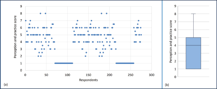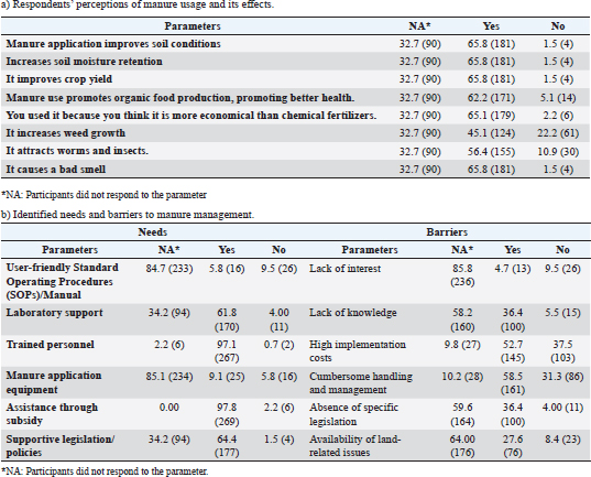 Fig. 3. Distribution of perception and practice scores on manure management: (a) scatter distribution of individual perception and practice scores among respondents (maximum score: 10) and (b) box-and-whisker plot. Perception and practice score analysisThe perceptions and practices of the respondents regarding farm waste management were assessed by scoring 10 parameters (Supplementary file 2). The median value of the score was 4, with an interquartile range of 1–5 (Fig. 3). Association between perception and practice scores and demographic characteristicsA significant positive correlation exists between “education” and “perception and practice score” (r=0.59, p < 0.01). Individuals with higher education levels are likely to achieve higher scores. The “no schooling” group has significantly lower scores than the other education levels. The differences observed were most noticeable between “no schooling” and “6th to 10th standard education” (–4.00), and “no schooling” and “10th to 12th standard education” (–3.59). Small but significant differences exist between “6th to 10th standard education” and “graduate education” (–0.64). A negative correlation (p < 0.05) was observed between “perception and practice score” and “age” (r = –0.38, p < 0.01). This suggests that as individuals get older, their scores tend to decline. The “more than 50 years” group has significantly lower scores compared to the “21–30 years” group (mean difference = –1.80, p < 0.01) and the “31–40 years” group (mean difference=–2.08, p < 0.01). The “41–50 years” group scored significantly lower than the “31–40 years” group (mean difference = –1.26, p < 0.01). On comparing the “herd size” and “perception and practice scores,” a herd size of more than 20 had a higher mean score than a herd size range of 10–20 animals and less than 10 animals (mean difference: 4.56 and 3.0, respectively). An independent samples t-test revealed a significant difference in scores between males (mean score = 3.93, SD = 1.94) and females (mean score = 2.99, SD = 2.22). Needs and barriers to farm waste managementParticipants ranked six needs and barriers parameters for manure management. Table 3a presents respondents’ perceptions of manure usage and its effects, and Table 3b presents survey responses regarding needs and barriers in manure management. Almost all (97.8%) of the participants emphasized the need for subsidies to promote the application of manure as fertilizer. Similarly, 97.1% of respondents agreed that trained personnel are required to ensure proper manure management. A majority of respondents did not provide input on the need for “user-friendly Standard Operating Procedures (SOPs)/manuals” (84.7% non-response) or “manure application equipment” (85.1% non-response) (Table 3a). According to 36.4% of respondents, the absence of specific legislation on manure management hinders the adoption of good practices, whereas 64.4% emphasized the need for supportive legislation and policies. The respondents admitted that the main barriers to implementing good manure management practices were lack of knowledge (36.4%), high cost of implementation (52.7%), cumbersome handling and management (58.5%), and land availability (27.6%). The majority of respondents believe that manure improves soil conditions (65.8%), and 65.1% of the farmers admitted that using dung as manure is an economical choice compared to synthetic fertilizers. In addition, 65.8% of farmers showed a positive attitude toward using manure, crop productivity, and the role of manure in improving soil moisture holding capacity. Also, most respondents agreed that manure encourages worm or insect infestation (56.4%) and bad odor (65.8%) after the application of manure on farms (Table 3a). Table 3. Perceptions, needs, and barriers related to manure usage and management. a)Respondents’ perceptions of manure usage and its effects.