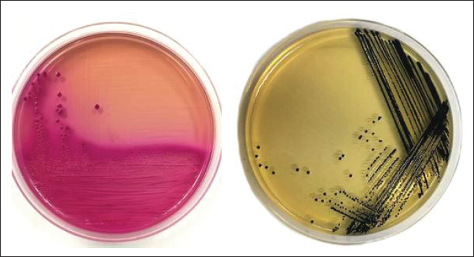 Fig. 1. Escherichia coli colonies on MCA selective media (A) and Salmonella spp. on SSA selective media (B). ResultBased on the results of this study, a total of 71 chicken meat samples were collected from 10 traditional markets in Gresik District. Of these, 61 samples (86%) were contaminated with E. coli, and 32 samples (45%) were contaminated with Salmonella spp. The results of isolation of E. coli bacteria on MCA media showed colonies with small, round shapes, dry, irregular, and pink color, whereas Salmonella spp. used TB media to increase the number of colonies. Then isolated using (SSA) media with a transparent shape and small black spots. The colonies of E. coli and Salmonella spp. are shown in Figure 1. Based on the results of this study, 86% (61/71) of the samples gave positive results due to contamination by E. coli bacteria. Chicken meat from the Menganti traditional market showed positive results for E. coli bacteria at 100% (11/11), Balong Panggang (9/9), Manyar (9/9), Gresik Kota, (7/7), and Duduk Sampeyan (3/3). Samples of chicken meat from the Wedoro Anom traditional market show 80% (4/5). Chicken meat from the Driyorejo and Kebomas traditional markets yielded a positive result of 71% (5/7). Chicken meat from the Benjeng traditional market was 67% (4/6). Chicken meat from the Cerme traditional market is 57% (4/7). Out of 71 meat samples, 32 (45%) were contaminated with Salmonella spp. The highest prevalence was observed in samples from Duduk Sampeyan Market (100%, 3/3), followed by Wedoro Anom Market (80%, 4/5), Driyorejo and Gresik Kota Markets (57%, 4/7 each), and Benjeng Market (50%, 3/6). Samples from the Menganti Market showed a prevalence of 45% (5/11), whereas those from the Balong Market showed a prevalence of 44% (4/9). Cerme and Kebomas Markets each showed a prevalence of 28% (2/7), and the lowest prevalence was found in Manyar Market (11%, 1/9). The results of E. coli and Salmonella spp. contamination in chickens are presented in Table 1. Antibiotic sensitivity test against E. coli and Salmonella spp. tested on MHA media. Sensitivity results showed a clear inhibition zone around the antibiotic disc. The results of the sensitivity test were compared with those of the Enterobacteriaceae group adapted according to the Clinical and Laboratory Standards Institute (CLSI, 2022). If there are more than or equal to three types of antibiotics from different groups showing resistance, then the antibiotics are categorized as MDR. The results of the sensitivity test are presented in Table 2. The antibiotic resistance profile of E. coli isolates from chicken meat collected in 10 traditional markets in Gresik District showed high levels of resistance to amoxicillin and ampicillin, each at 75% (47/61). Resistance to oxytetracycline was observed in 59% (36/61) of the isolates, followed by streptomycin 49% (30/61), sulfonamide trimethoprim 44% (27/61), ciprofloxacin 29% (18/61), gentamicin 27% (17/61), chloramphenicol 13% (8/61), and azithromycin 3% (2/61). In Salmonella spp. isolates, the highest resistance was observed against oxytetracycline (84% (27/32), followed by azithromycin 65% (21/32), sulfonamide trimethoprim 53% (17/32), ampicillin 43% (14/32), streptomycin 34% (11/32), amoxicillin 31% (10/32), ciprofloxacin 15% (5/32), gentamicin 12% (4/32), and chloramphenicol 9% (3/32). MDR, defined as resistance to three or more antibiotic classes, was identified in 42% (26/61) of E. coli isolates and 43% (14/32) of Salmonella spp. isolates (Table 3). Table 1. Contamination results of E. coli and Salmonella spp. in chicken.