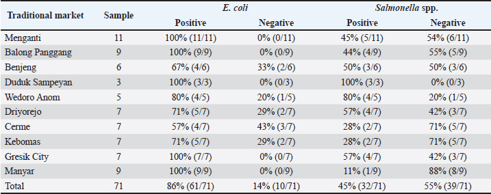 DiscussionEscherichia coli and Salmonella spp. are Gram-negative bacteria that can contaminate foodstuffs originating from animal products such as chicken meat (Obe et al., 2020; Putri et al., 2023). Based on the results of this study, the prevalence of E. coli originating from chicken meat in traditional markets in the Gresik District was 86% (61/71). This result is much higher than Sri Lanka 66.8% (167/250) (Ranasinghe et al., 2022), 50% (6/12) in Denpasar (Pratiwi et al., 2022), Lamongan district 11% (3/26) (Kartikasari et al., 2019), but lower than that of Pakistan (95.6%) of frozen chicken carcasses (Eltai et al., 2020). This is because E. coli can contaminate food when slaughtering animals, unhygienic handling, and unclean market environmental conditions for food storage and processing (Effendi et al., 2018b; Kendek et al., 2024). The results showed that chicken meat from 10 traditional markets in the Gresik district was contaminated with Salmonella spp. by 45% (32/71). This result is much higher than that of Salmonella in Nigeria, 32.1% (17/53) (Adeyanju and Ishola, 2014), Makassar, 12.5% (3/24), but lower than Malaysia, 84.4% (Shafini et al., 2017). This is influenced by poor sanitation, personal hygiene, open sales areas, meat that is stacked with other meat, and a dirty environment (Saravanan et al., 2015; Ansharieta et al., 2021b). Escherichia coli and Salmonella spp. can cause diseases of the urinary tract, diarrhea, septicemia, and meningitis (Bhattarai et al., 2023; Pokharel et al., 2023). Prevention of contamination by E. coli and Salmonella spp. bacteria can be done by sanitizing cages, clean environment, and cross-contamination, as in traditional markets synonymous with unsterile slaughter, disorderly environment, dirty, less clean water, and meat that is sold just placed without using clean mats (Pradika et al., 2019; Widodo et al., 2023). Chicken meat contaminated with E. coli and Salmonella spp. can be consumed if handled properly, such as meat cooked at a high temperature of at least 70°C (Afshari et al., 2018). Water quality as a cause of contamination of E. coli and Salmonella spp. with the characteristic quality of water that is cloudy and smells of ammonia. This is in accordance with Dameanti et al. (2023), who reported that the presence of E. coli in water indicates that water can be contaminated with animal waste. Contaminated water contains E. coli, Salmonella spp., and S. aureus, which can contaminate chicken meat (Shafini et al., 2017; Ranasinghe et al., 2022). The observed increase in antibiotic resistance in chicken meat contaminated with E. coli and Salmonella spp. is likely attributable to cross-contamination during handling and processing at traditional markets. Such cross-contamination between meat products and market workers may facilitate the horizontal transmission of resistant bacteria, thereby contributing to the emergence and spread of multidrug-resistant strains (Fanissa et al., 2022). Based on the results of this study, a high incidence of resistance was observed in meat contaminated with E. coli bacteria, namely amoxicillin 75% (47/61), ampicillin 75% (47/61) and oxytetracycline 59% (36/61), streptomycin 49% (30/61), trimethoprim sulfonamide 44% (27/61). The results of the study of Salmonella spp. showed high resistance to oxytetracycline 84% (27/32), azithromycin 65% (21/32), sulfonamide trimethoprim 53% (17/32), ampicillin 43% (14/32), streptomycin 34% (11/32), and amoxicillin 31% (10/32). The results of previous studies showing resistance to ampicillin in chicken meat showed resistance at a percentage of 90% (Rahmaniar et al., 2021). The use of antibiotics that are often used, namely ampicillin, amoxicillin, and oxytetracycline, is very susceptible to resistance because these antibiotics are easy to reach and relatively cheap (Manyi-Loh et al., 2018). Table 2. Antibiotic resistance test results against E. coli and Salmonella spp.