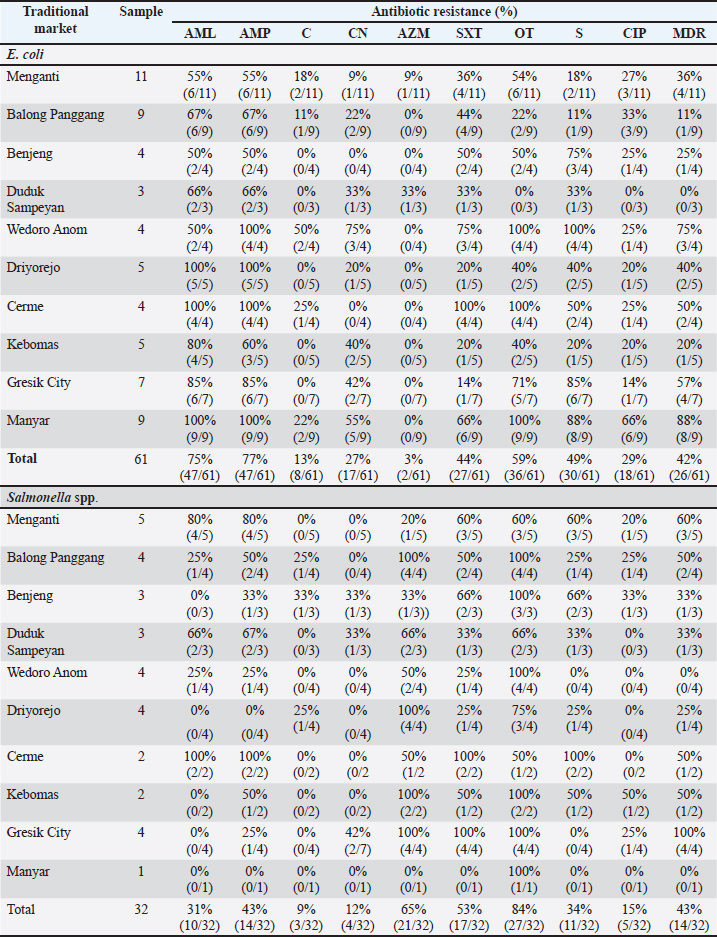 Open Vet. J.. 2025; 15(5): 2160-2170 Open Veterinary Journal, (2025), Vol. 15(5): 2160-2170 Research Article Antibiotic resistance profiles of Escherichia coli and Salmonella spp. isolated from chicken meat sold in traditional markets in Gresik District, East Java, IndonesiaFreshinta Jellia Wibisono1, Mustofa Helmi Effendi2, Wiwiek Tyasningsih3*, Reina Puspita Rahmaniar4, Aswin Rafif Khairullah5, Irfan Alias Kendek1, Budiastuti Budiastuti6, Vinsensius Rianto1, Dicky Candra Nico4, Dea Anita Ariani Kurniasih7, Salsabila Salwa1, Dinda Prisilya Diningrum4, Ikechukwu Benjamin Moses8 and Riza Zainuddin Ahmad51Veterinary Public Health Laboratory, Faculty of Veterinary Medicine, Universitas Wijaya Kusuma Surabaya, Surabaya, Indonesia 2Division of Veterinary Public Health, Faculty of Veterinary Medicine, Universitas Airlangga, Surabaya, Indonesia 3Division of Veterinary Microbiology, Faculty of Veterinary Medicine, Universitas Airlangga, Surabaya, Indonesia 4Veterinary Microbiology Laboratory, Faculty of Veterinary Medicine, Universitas Wijaya Kusuma Surabaya, Surabaya, Indonesia 5Research Center for Veterinary Science, National Research and Innovation Agency (BRIN), Bogor, Indonesia 6Study Program of Pharmacy Science, Faculty of Health Science, Universitas Muhammadiyah Surabaya, Surabaya, Indonesia 7Research Center for Public Health and Nutrition, National Research and Innovation Agency (BRIN), Bogor, Indonesia 8Department of Applied Microbiology, Faculty of Science, Ebonyi State University, Abakaliki, Nigeria *Corresponding Author: Wiwiek Tyasningsih. Division of Veterinary Microbiology, Faculty of Veterinary Medicine, Universitas Airlangga, Surabaya, Indonesia. Email: wiwiek-t [at] fkh.unair.ac.id Submitted: 15/02/2025 Revised: 15/04/2025 Accepted: 21/04/2025 Published: 31/05/2025 © 2025 Open Veterinary Journal