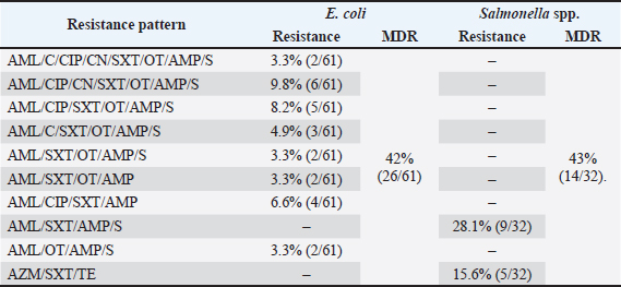 Table 3. Antimicrobial resistance pattern of multidrug resistance E. coli and Salmonella spp.