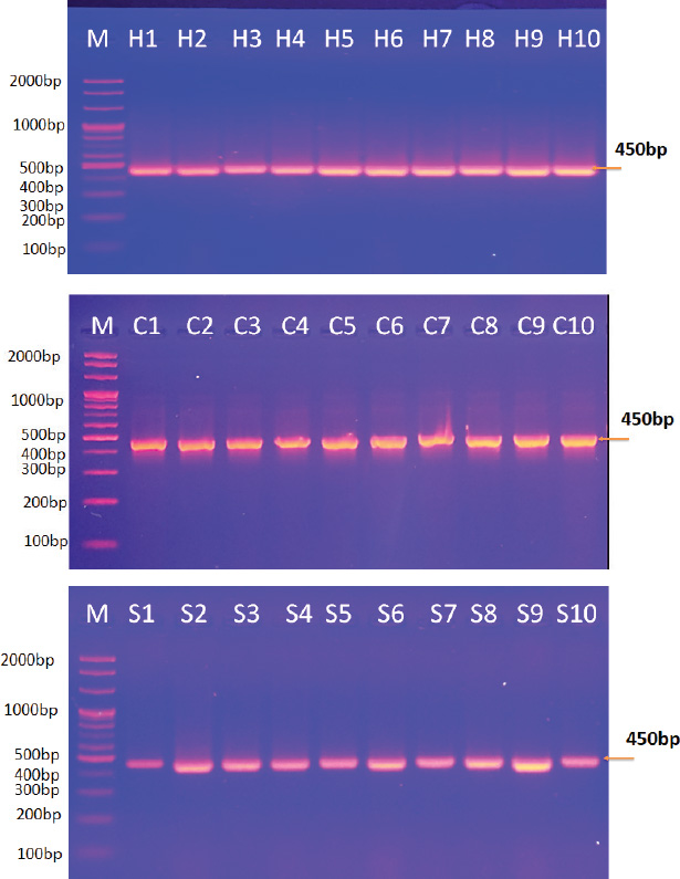 Fig. 1. Agarose gel electrophoresis image showing the PCR product analysis of Echinococcus granulosus mitochondrial cytochrome oxidase subunit 1 (COX1) gene from extracted DNA of hydatid cyst fluid of humans (H1-H10: positive samples), sheep (S1-S10: Positive samples), and cattle (C1-C10: Positive samples). M: marker (2,000-100bp).
