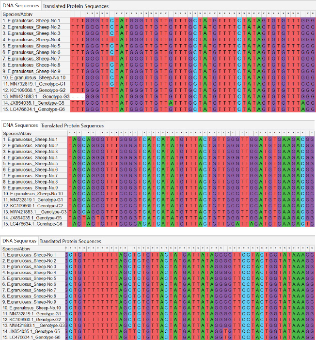 Fig. 3. ClustalW multiple sequence alignment of partial mitochondrial Cox1 gene sequences from local Echinococcus granulosus sheep isolates. This comparison aligned the sequences with the associated E. granulosus genotypes from the NCBI-BLAST database. The alignment indicates areas of homology (marked with stars (*), corresponding to conserved sequences, and genetic divergence between the nucleotide sequences of the sheep isolates. These results illustrate the genetic diversity and conserved elements of the mitochondrial Cox1 gene of E. granulosus.