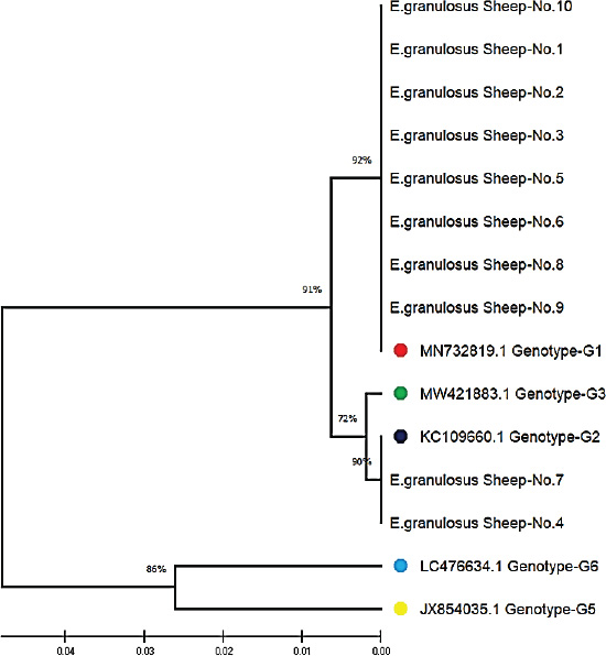 Fig. 6. Phylogenetic tree analysis based on the partial mitochondrial Cox1 sequence of Echinococcus granulosus from local sheep samples (color-filled circles). This is based on the evolutionary distances and Maximum Composite Likelihood method (UPGMA tree) in (MEGA 6.0 version). Interestingly, Pereira et al. (2022) discovered the difference in the expression of genes for immune modulation between cattle and sheep cysts that may influence genotype diversity between hosts. In addition, Aziz et al. (2022) conducted studies in Kurdistan, Iraq, and also detected a greater frequency of hydatid cysts in sheep (66.7%), providing evidence for host-specific dynamics in infection behavior. These results indicate that sheep are primary intermediate hosts during the life course of G1 and related genotypes. In the cattle, the G1 (98.40%–99.75%) and G3 (98.65%–99.50%) genotypes were identified, in accordance with various studies. Celik et al. (2024) confirmed the genotypes of G1 and G3 in cow isolates from Turkey as both hosts and intermediaries. In the United States, Jesudoss Chelladurai et al. (2024) verified that the G1 and G3 genotypes in cattle are endemic to domestic dog ruminant cycles (Jesudoss Chelladurai et al., 2024). Contrastingly, Gholami et al. (2021) reported the discovery of G5 (buffalo strain) in sheep and goats in Iran, implying that host- and environment-driven genotype variations occur regionally. Additionally, Kheninef et al. (2024) observed intragenotype variation in the G1 and G3 genotypes in Algeria, indicating genetic variation even within the dominant strains. These variations could be accounted for by regional variations in genotype incidence and pathogenicity (Karim et al., 2019).