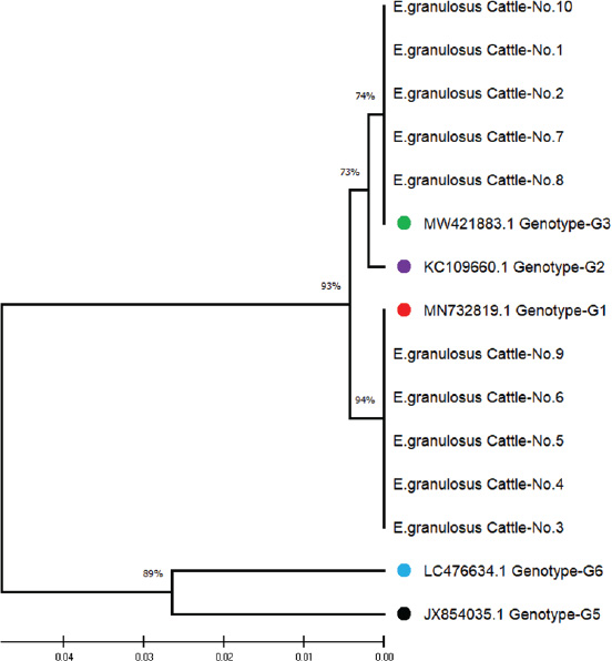 Fig. 7. Phylogenetic tree analysis based on the mitochondrial Cox1 gene partial sequence used for E. granulosus from local cattle samples (color-filled circles). This is based on the evolutionary distances and Maximum Composite Likelihood method (UPGMA tree) in (MEGA 6.0 version). Because G1 is dominant in isolates from humans, sheep, and cattle, its zoonotic importance and cross-host adaptability are clear. Studies by Omondi et al. (2020) from Kenya and Guo et al. (2023) from China also reported G1 as the dominant genotype among several host species, confirming its international validity. However, G2 and G3, in particular hosts, indicate that region-wide epidemiological research is needed to get a better handle on how genotypes are distributed and how they shift in transmission (Janabi, 2021). Genetic variations among E. granulosus isolates are relevant for disease surveillance. Pereira et al. (2022) demonstrated how genotype-dependent immune regulation in host-specific cells could be manipulated for vaccine and therapy development. What’s more, the introduction of genotypes such as G5 by Gholami et al. (2021) also has people worried about E. granulosus’s adaptation to novel hosts and environments that must constantly be monitored. ConclusionThis study confirmed the presence of three genotypes of E. granulosus in Iraq: G1, G2, and G3. G1 was most common in all hosts, particularly in humans. Phylogenetic analysis revealed that each host had closely related strains. G1 poses a serious public health and economic threat due to its high zoonotic potential. AcknowledgmentNone. FundingThis work was self-funded by the authors. Authors’ contributionsAll authors have participated equally in the research. Conflict of interestThe authors declare no conflict of interest. Data availabilityAll data can be provided upon request. ReferencesAgha, S.A.F.A. 2015. Genotyping of cystic Echinococcosis isolates from human and animals clinical samples. MSc Thesis, College of Veterinary Medicine, University of Al-Qadisiyah. Ali, R., Nazeer, S., Elahi, M.M.S., Idu, E.G., Zhang, H., Mahmoudvand, H., Khan, S.N. and Yang, J. 2024. Global distribution and definitive host range of Echinococcus species and genotypes: a systematic review. Vet. Parasitol. 331, 110273; doi: 10.1016/j.vetpar.2024.110273. Almashhadany, D., Aziz Jamil Alani, A., Ahmed Dhiab, A., AbdulMona M. Zainel, M. and Talal Abdulrahman, T. 2024. Public health significance of human toxoplasmosis. IntechOpen; doi: 10.5772/intechopen.114338. Aziz, H.M., Hama, A.A. and Hama Salih, M.A. 2022. An epidemiological study of hydatid cyst of Echinococcus granulosus in Sulaimani, Iraq. Ann. Parasitol. 68(2), 241–246. Celik, F., Selcuk, M. A., Kilinc, S. G., Kesik, H. K., Ahmed, H., Wang, Y., Simsek, S. and Cao, J. 2024. Molecular discrimination of G1 and G3 genotypes of Echinococcus granulosus sensu stricto obtained from human, cattle, and sheep using the mitochondrial NADH dehydrogenase subunit 5 marker. Acta Trop. 252, 107124. Derakhshani, A., Mousavi, S.M., Rezaei, M., Afgar, A., Keyhani, A.R. and Mohammadi, M.A., Dabiri, S. and Fasihi Harandi, M. 2023. Natural history of Echinococcus granulosus microcyst development in long-term in vitro culture and molecular and morphological changes induced by insulin and BMP-4. Front. Vet. Sci. 9, 1068602; doi: 10.3389/fvets.2022.1068602. Ghazi, A.M., Al-Bayati, A.M.A. and Janabi, A.H.D. 2024. Metabolomics-detected alterations generated by phytosomal propolis and phytosomal lycopene in male rats with induced benign prostatic hyperplasia. Iraqi J. Vet. Sci. 38(Supplement I-IV), 7–15; doi: 10.33899/ijvs.2024.147764.3531. Gholami, S., Behrestaghi, L.E., Sarvi, S., Alizadeh, A. and Spotin, A. 2021. First description of Echinococcus ortleppi (G5 genotype) in Iran. Parasitol. Int. 83, 102316; doi: 10.1016/j.parint.2021.102316. Guo, B., Zhao, L., Zhao, L., Mi, R., Zhang, X., Wang, B., Guo, G., Ren, Y., Qi, W. and Zhang Z. 2023. Survey and molecular characterization of Echinococcus granulosus sensu lato in Xinjiang, China. Pathogens. 12(1), 134; doi: 10.3390/pathogens12010134. Hodžić, A., Alić, A., Spahić, A., Harl, J. and Beck, R. 2022. Genetic diversity of Echinococcus granulosus sensu lato from animals and humans in Bosnia and Herzegovina. Parasites Vectors 15(1), 457. Hogea, M.O., Ciomaga, B.F., Muntean, M.M., Muntean, A.A., Popa, M.I. and Popa, G.L. 2024. Cystic echinococcosis in the early 2020s: a review. Trop. Med. Infect. Dis. 9(2), 36; doi: 10.3390/tropicalmed9020036. Janabi, A.H.D. 2021. Molecular docking analysis of anti-severe acute respiratory syndrome-coronavirus 2 ligands against spike glycoprotein and the 3-chymotrypsin-like protease. J. Med. Signals Sens. 11(1), 31–36; doi: 10.4103/jmss. JMSS_25_20. Jesudoss Chelladurai, J.R.J., Quintana, T.A., Johnson, W.L., Schmidt, C., Righter, D. and Howey, E. 2024. Cystic echinococcosis in cattle and sheep in the USA. Parasit. Vectors. 17(1), 128; doi: 10.1186/s13071-024-06192-x. Karim, S., Mansour, K., Janabi, A.H.D. and Al-Nakeeb, N. 2019. First phylogenetic characterization of Pseudocowpox virus from cattle in Al-Qadisiyah province, Iraq. Iraqi J. Vet. Sci. 33(1), 123–126; doi: 10.33899/ijvs.2019.125525.1047. Kheninef, A., Celik, F., Aissaoui, L. and Simsek, S. 2024. Molecular characterization of hydatid cyst isolates from Algeria. Parasitol. Res. 123(3), 159; doi: 10.1007/s00436-024-08176-3. Liguori, G., Costagliola, A., Lombardi, R., Paciello, O. and Giordano, A. 2023. Human-animal interaction in animal-assisted interventions (AAIs): zoonosis risks, benefits, and future directions—A one health approach. Animals. 13(10), 1592; doi: 10.3390/ani13101592. Oliveira, F.M.S., Cruz, R.E., Pinheiro, G.R.G. and Caliari, M.V. 2022. Comorbidities involving parasitic diseases: a look at the benefits and complications. Exp. Biol. Med. 247(20), 1819-1826; doi: 10.1177/15353702221108387. Omondi, H.A., Gitau, G., Gathura, P., Mulinge, E., Zeyhle, E., Kimeli, P. and Bett