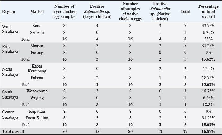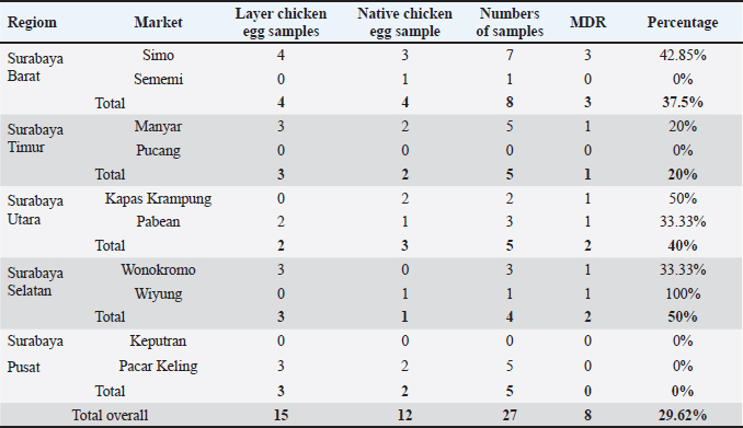 AbstractBackground: The virulence of Salmonella sp. is increased by the presence of the mgtC gene, which allows the bacteria to survive in environments with low magnesium levels, such as inside macrophages. Salmonella sp. found on eggshells when they show resistance to three or more classes of antibiotics can be classified as multidrug-resistant (MDR) bacteria. Aim: This study aimed to identify the presence of Salmonella sp. MDR and the mgtC gene in chicken eggshell swabs from traditional markets in Surabaya. Methods: Swab samples were collected from 160 eggs (80 from layer chickens and 80 from free-range chickens) at 10 traditional markets in Surabaya, Indonesia. Isolation and identification were performed using culture media, including Salmonella Shigella Agar, Gram staining, Triple Sugar Iron Agar, Sulfide Indole Motility, Simmons Citrate Agar, Methyl Red and Voges Proskauer, and Urea Agar. Antibiotic sensitivity testing was performed using the disc diffusion method on Mueller–Hinton Agar. Molecular detection of the mgtC gene was performed using polymerase chain reaction. Results: The results showed that 16.87% (27/160) of the samples were detected positive for Salmonella sp. All Salmonella sp. isolates (27) were resistant to Erythromycin (100%). Resistance was also found to Ampicillin (77.77%, 21/27), Tetracycline (29.62%, 8/27), and Ciprofloxacin (18.51%, 5/27). No resistance to chloramphenicol was observed. In addition, eight of the 27 isolates (29.62%) were classified as Salmonella sp. MDR. The Salmonella sp. MDR isolates also carried the mgtC gene at 87.5% (7/8). Conclusion: These findings demonstrate the potential global public health threat posed by MDR Salmonella sp. with the mgtC gene, emphasizing the importance of monitoring and controlling antibiotic resistance in humans and animals. Keywords: Eggs, MDR, mgtC, Public health, Salmonella sp.. IntroductionSalmonella sp. is a Gram-negative, pathogenic bacteria and is the most common foodborne disease-causing agent found worldwide (Lamichhane et al., 2024). Salmonella sp. can cause salmonellosis, a zoonotic disease that attacks the digestive tract with a high rate of transmission to animals and humans (Galán-Relaño et al., 2023). The virulence factor in Salmonella sp. is one of the causes of the high incidence of salmonellosis because it allows these bacteria to survive in an unsupportive environment and cause infection (Yulian et al., 2020). One of the important virulence factors of Salmonella pathogenicity island 3 is the gene encoding mgtC (Choi et al., 2019). This gene is commonly found in certain Salmonella serotypes, especially those with higher pathogenic potential, such as Salmonella enterica, which can cause infections in humans and animals. The transfer of the mgtC gene can occur through horizontal gene transfer (HGT) mechanisms. Moreover, the mgtC gene can also be passed on through vertical gene transfer during bacterial cell division. However, HGT is more commonly involved in the spread of this gene among different strains or species of Salmonella (Andesfha et al., 2019). The mgtC gene plays an important role in the production of the mgtC protein, which functions to bind the F F types of antibiotics, which are categorized as multidrug resistant (MDR). According to Marchello et al. (2020), 32.6% (1,638/5,032) of Salmonella typhi isolates from Asia during 2015–2018 have been identified as MDR. Eggs are a livestock product that plays an important role as a source of animal protein for humans (Puglisi and Fernandez, 2022). In addition to having high nutritional content, eggs are also popular because of their delicious taste and can be processed into various types of food (Réhault-Godbert et al., 2019). Eggs that are commonly consumed come from layer chickens and native chickens. Layer chicken eggs are easier to find in traditional markets because their production is higher and more stable than that of native chicken (Mir et al., 2017). However, both layer and native chicken eggs sold in traditional markets are often susceptible to contamination (Rouger et al., 2017). Traditional markets, including those in Surabaya, often have inadequate sanitation, making them an ideal environment for the growth and spread of various pathogens (Putri et al., 2024). Poor hygiene, a high number of visitors, and uncontrolled environmental conditions can increase the risk of contamination with food products, including eggs from native and layer chickens (Kendek et al., 2024). These eggs can easily be exposed to bacteria from dust, soil, or unhygienic water, as well as from the hands of sellers or unclean 10 equipment (Mkangara, 2023). Unhygienic conditions ATP synthase enzyme. By binding to this enzyme, mgtC can reduce the influx of H+ ions into the cell, thereby helping the bacteria maintain ATP levels even when intracellular magnesium (Mg²+) concentrations are low (Lee et al., 2013). The presence of mgtC protein enables the bacteria to survive and replicate at low levels within phagocytic cells (Groisman et al., 2013). Without mgtC, Salmonella cannot survive in the stressful intracellular environment of low Mg²+ levels. Salmonella sp. carrying the mgtC virulence gene tends to be more resistant to intracellular stress, allowing them to survive and reproduce in macrophages, where they should function to kill pathogens (Garai et al., 2012). In addition to virulence factors, antibiotic resistance also plays a role in the increased number of Salmonella sp. infection cases. The significance of Salmonella sp. is also related to public health issues arising from antibiotic-resistant isolates (antimicrobial resistance) in both veterinary and human medicine (Siriken et al., 2020). According to Gach et al. (2024), Southeast Asia is one of the regions with the highest levels of antibiotic resistance in the world, with Indonesia ranking eighth out of 27 countries with a high burden of antibiotic resistance. Salmonella sp. isolates found on eg