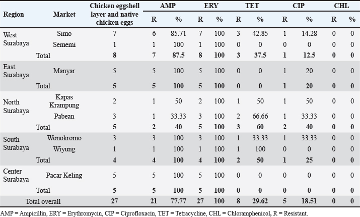 Fig. 2. Multidrug resistant in Salmonella sp. Description: AMP=Ampicillin, ERY = Erythromycin, CIP = Ciprofloxacin, TET = Tetracycline, CHL = Chloramphenicol.
