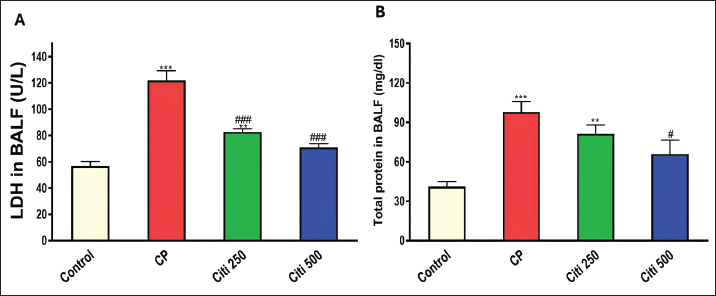Fig. 2. Influence of citi on CP-induced changes in LDH levels and protein content in BALF: The impact of oral daily citi treatment (250, 500 mg/kg) for 14 days with a single i.p. injection of CP (200 mg/kg) on day 7 on: A. LDH level; B. protein content. The mean ± SEM is used to express data. n=6. ***p < 0.001, ** p < 0.01 versus the control; ### p < 0.001, # p < 0.01 versus the CP group. CP: cyclophosphamide, citi: citicoline, LDH: lactate dehydrogenase, BALF: bronchoalveolar lavage fluid.