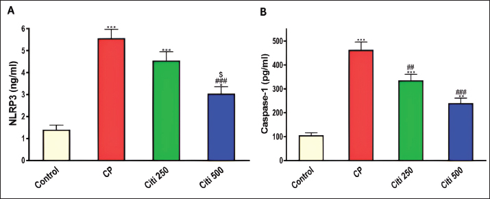 Fig. 5. Impact of citi on CP-induced activation of the NLRP3 inflammasome pathway: The impact of oral daily citi treatment (250, 500 mg/kg) for 14 days with a single i.p. injection of CP (200 mg/kg) on day 7 on: A. NLRP3 level in BALF; B. Caspase-1 level in BALF. The mean ± SEM is used to express data. n=6. ***p < 0.001, ** p < 0.01, * p < 0.05 versus the control; ### p < 0.001, ## p < 0.01 versus the CP group; $ p < 0.05 versus the citi 250 group. CP: cyclophosphamide, citi: citicoline, NLRP3: NOD-like receptor protein 3, BALF: bronchoalveolar lavage fluid. Lung tissue from rats exposed to CP exhibited thickened alveolar walls, extensive inflammatory cell infiltration, hemorrhage, and congestion. These observations are consistent with a previous study reporting alveolar cell damage, increased alveolar septal thickness, and infiltration of edema, epithelial cells, polymorphonuclear cells, and erythrocyte cells in the alveolar lumen following CP administration (Alsemeh and Abdullah, 2022). In contrast, rats treated with citi showed significant improvement in lung damage, characterized by reduced alveolar wall thickness and milder alveolar emphysema in a dose-dependent manner. This protective effect is likely attributable to citi’s ability to mitigate inflammatory responses (Ek et al., 2014). Citi is known to inhibit NF-κB, thereby reducing the production and release of proinflammatory cytokines (Cavalu et al., 2024). ROS directly causes tissue damage and triggers inflammatory responses by activating various proinflammatory cytokines. Oxidative stress elevation and subsequent lipid peroxidation contribute to tissue inflammation and necrosis (Zhang and An, 2007). Acrolein, a toxic metabolite of CP, causes cell damage through free radical generation, which binds to GSH, depleting its levels in the cell (Araghi et al., 2018). Lipid peroxidation is characterized by the presence of MDA, which functions as both a marker and signal of lipid peroxidation (Ibrahim et al., 2020). CP administration is known to induce oxidative stress, significantly raising MDA levels in the lungs while decreasing GSH, SOD, catalase, and GH-Px levels in comparison to the control group (Ghosh et al., 2015). Another study reported reduced GSH levels and SOD activity, alongside increased MDA levels, following CP exposure (Şengül et al., 2017). However, treatment with citicoline was found to enhance the antioxidant defense system, restoring GSH levels and decreasing lipid peroxidation and MDA concentrations. Multiple studies have demonstrated that citicoline effectively inhibits ROS production (Abdel-Salam et al., 2019; El-Baz et al., 2023). NO plays a significant role in CP-induced toxicity (Elsayed et al., 2022). In this study, CP administration caused a notable elevation of NOx levels, consistent with previous findings suggesting that the elevation in NOx is linked to the overexpression of inducible nitric oxide synthase (iNOS) (Sun et al., 2021). NO can react with superoxide anions to produce peroxynitrite (Radi, 2018), which may cause NF-κB activation, thus an elevation in proinflammatory cytokine production and inflammatory response (Yee et al., 2021). Conversely, citi treatment reduced the rise in NOx levels, as observed in prior studies investigating its effects in animal models of tissue injury, such as head irradiation-induced brain damage and sodium arsenite-induced nephrotoxicity (Abdel-Aziz et al., 2021; Khodayar et al., 2024). Furthermore, citi has been shown to inhibit iNOS activity in studies examining its impact on γ-radiation-induced splenic inflammation in rats (Abdel-Aziz and Saif-Elnasr, 2024).