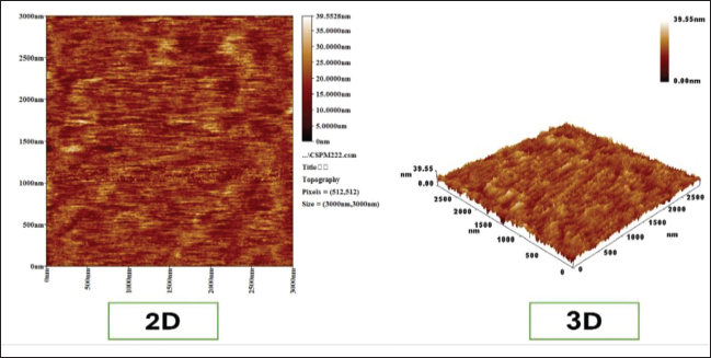 Fig. 1. Atomic force microscopy of Chitosan NPs synthesized using sol-gel methods illustrates 2D and 3D topological structures. Characterizing the chemical structure of the CNPs, A. vera gel, and CNPs-AV, FTIR spectroscopy was conducted in Figures 2–4. Peaks in a narrow range were observed at 3440.77–3454.27 cm–1 for CNPs, 3423.41 cm–1 for A. vera gel, and 3406.05–3460.06 cm–1 for CNPs-AV. These peaks correspond to the stretching vibrations of –NH2 and –OH groups. The region corresponding to 2923.88–2893.02 cm–1 for CNPs, 2956.67–2925.81 cm–1 for A. vera gel, and 2858–2925.81 cm–1 for CNPs-AV is associated with the stretching vibrations of the C–H or –CH3 groups. The existence of N-acetyl groups or C=O stretching vibrations of amide I appears to be evident as a band at 1645.17 cm–1 in the CNP spectra, while the band at 1631.67 cm–1 in CNPs-AV spectra possibly belongs to NH primary amine groups. The band at 1639.38 cm–1 in A. vera gel may also be caused by the C=C stretching vibrations of alkenes. Moreover, the peak at 1714.60–1733.89 cm–1 corresponds to the carbonyl (C=O) groups of acids, ketones, or aldehydes.