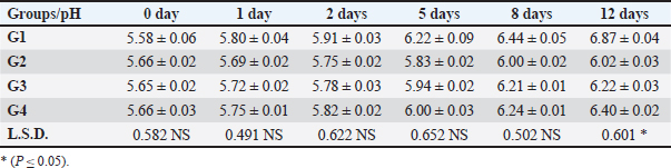 Thiobarbituric acid (TBAs)The results presented in Table 3 demonstrate the effect of CNPs-AV on the TBA reactive substances (TBA) values of mutton meat samples during refrigerated storage. Significant effects (P < 0.05) on the TBA values were observed in G2 and G3 on days 2, 5, and 8 of storage at 4 °C. By day 12, the TBA values significantly increased (P < 0.05) across all groups. On day 5, the highest TBA value was recorded in the control group (G1) at 1.14 MDA mg/kg, whereas the lowest TBA value (0.34 MDA mg/kg) was observed in G2. On day 8, the TBA value in G1 increased to 1.45 MDA mg/kg, while G2 maintained the lowest value at 0.67 MDA mg/kg. By day 12, the TBA value in G1 peaked at 2.62 MDA mg/kg, in contrast to the significantly lower value of 0.71 MDA mg/kg in G2. Sensory evaluationThe results of the sensory analysis of the mutton meat samples are in Table 4. Storage time had significant effects (P < 0.05) on sensory attributes such as color, odor, and overall acceptability. The panelists assessed the samples according to a five-point hedonic scale in which a score of 5 was classified as “excellent” and a score of 1 as “unacceptable”. The control samples were found to be unacceptable after 8 days of refrigerated storage. Alternatively, CNP-coated samples maintained higher acceptability (3.8). On day 12, CNP+AV recorded a score of 3.6, indicating higher retention of sensory quality. Mutton meat treated with Chitosan and A. vera also significantly slowed the alteration of the red color, as the mutton retained an acceptable appearance even after 12 days of storage. DiscussionConfirmation of nanoparticles materialsAtomes force microscope (AFM)Nanoparticles with smaller sizes give more variety, are more stable, and allow a controlled release of bioactive materials, which are beneficial for improving the quality of meat products. This is consistent with the findings of Lee et al. (2020), who emphasized the importance of nanoparticle sizes in improving the shelf life of meat products by suppressing microbial growth and lipid oxidation. The findings demonstrate how the size of nanoparticles affects how they interact with the surfaces of meat, helping to maintain its freshness and safety. Table 2. pH result of mutton meat at refrigerator temperature.