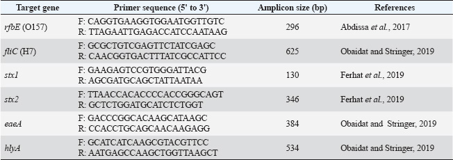 ABSTRACTBackground: The zoonotic pathogen Escherichia coli O157: H7, known as enterohemorrhagic E. coli (EHEC), is a public health concern associated with acute gastrointestinal diseases and hemolytic uremic syndrome. The primary reservoirs of EHEC are ruminants, including cattle and, potentially, sheep. However, data on EHEC prevalence and antimicrobial resistance (AMR) in Jordanian sheep are scarce. Aim: This study aimed to examine the prevalence of EHEC and to assess antibacterial resistance patterns in non-EHEC E. coli isolates from Awasi sheep in Central Jordan. Methods: Rectal swabs from 198 sheep were collected and analyzed using conventional bacteriological methods and polymerase chain reaction (PCR) for genotypic confirmation of EHEC. The sample size was calculated using an anticipated prevalence of 5%, a confidence level of 95%, and a precision of 3%. Antimicrobial susceptibility testing was performed using the disc diffusion method for ciprofloxacin, ampicillin, and erythromycin, with findings interpreted according to standards. Results: None of the 198 EHEC isolates were identified among the 198 samples. However, 18 samples (9%) contained non-EHEC E. coli isolates, all of which exhibited resistance to at least one antibiotic. Notably, all isolates (100%) showed resistance to ampicillin, 94.4% to erythromycin, and 5.6% were ciprofloxacin-resistant. No significant variations in prevalence were found between sampling sites (p=0.78). Conclusion: The absence of EHEC in local sheep suggests that they are not a primary source of this pathogen in Jordan. However, the observed AMR in non-EHEC isolates highlights the need for stringent sanitary practices and antimicrobial stewardship to mitigate public health risks. Seasonal and age-related variations should be explored in future longitudinal studies. Keywords: E. coli O157:H7, Antimicrobial resistance, Zoonotic pathogens, Awasi sheep, Jordan. IntroductionFoodborne diseases caused by microbiological pathogens pose a critical threat to food safety and public health worldwide. Among these, Escherichia coli O157:H7, a strain of enterohemorrhagic E. coli (EHEC), is a major concern due to its potential to cause severe symptoms of gastrointestinal illness, including hemorrhagic colitis and other conditions, such as hemolytic uremic syndrome (HUS) (Busani et al., 2005; Ferens and Hovde, 2011; Rahal et al., 2012). EHEC is primarily associated with ruminants, particularly cattle, which act as asymptomatic reservoirs for this zoonotic pathogen (Elder et al., 2000; Rahal et al., 2012). However, the role of sheep as potential carriers of EHEC is poorly understood, particularly in the Middle East region. The Awasi sheep breed is indigenous to Jordan and represents a substantial proportion of the country’s livestock industry. These sheep are commonly present in local markets and contribute significantly to the food supply chain. Despite this, no previous study has specifically assessed the prevalence of EHEC in live Awasi sheep in the Jordanian market. Given that sheep may act as vectors for zoonotic transmission, understanding their role in the epidemiology of EHEC is critical for public health monitoring and infection control strategies (Al-Barakeh et al., 2024). Antimicrobial resistance (AMR) of E. coli isolates from livestock adds another layer of complexity to food safety concerns. Antibiotic overuse and misuse in animal husbandry contribute to the development of resistant strains of bacteria. These bacteria can be transmitted to humans via direct contact or consumption of contaminated products (Reid et al., 2002; Hajian et al., 2011). Studies in Jordan and neighboring regions have reported varying levels of antibiotic resistance in E. coli, underscoring the need for localized research to inform mitigation strategies (McCarthy et al., 2021). This study investigated the prevalence of EHEC in Awasi sheep in Central Jordan and evaluated the antibacterial susceptibility of non-EHEC E. coli isolates. The outcomes of this study will enhance our understanding of the role of sheep in EHEC transmission and the possible dangers associated with antibiotic resistance in the livestock industry. Materials and MethodsDetermination and collection of sample sizeThe sample size was determined using the formula n=Z²P(1−P)/d², where Z represents the Z statistic for a 95% confidence level (1.96), P denotes the anticipated prevalence (5% based on regional research), and d signifies the precision (3%). This yielded a minimum sample size of 196, which was rounded to 198. This sample size provides 80% power for detecting EHEC at the expected prevalence rate. A total of 198 male Awasi sheep, approximately 1.5 years old, were randomly selected from six sublocations within the Central Jordan livestock market. Thirty-three rectal swabs were collected per sublocation (n=198) during the first week of April 2024. While this sampling strategy focused on a specific demographic and period, it provided a cross-sectional snapshot of the target population. We acknowledge this as a limitation that affects our ability to generalize our findings to female sheep, different age groups, and seasonal variations. Samples were obtained using sterile cotton swabs, immediately placed in Stuart’s transport media (Oxoid, UK), and maintained under refrigerated conditions (4°C) until processing in the laboratory within 24 hours of collection. All collection procedures were performed using aseptic techniques, with field and laboratory personnel wearing appropriate personal protective equipment to minimize cross-contamination. EHEC isolation using the conventional methodIn each testing group, E. coli O157:H7 (ATCC 43895) served as the positive control, whereas nontoxigenic E. coli (NCTC 12900) served as the negative control for bacterial isolation. Rectal swabs were immersed in 50 ml of Trypticase Soy Broth modified with Novobiocin (8 mg/l) (MTSB) (Condalab, Madrid, Spain) and incubated at