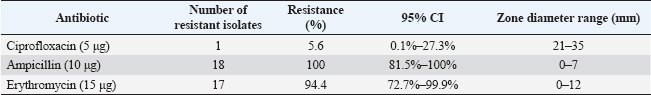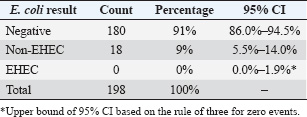 The selected antibiotics were ciprofloxacin (5 μg/disc), Ampicillin (10 μg/disc), and Erythromycin (15 μg/disc) (HiMedia, India). These antibiotics were selected based on their common use in veterinary and human medicine in Jordan and their clinical relevance (Abdissa et al., 2017; Ferhat et al., 2019). After 18–24 hours of incubation at 37°C, zone diameters were measured and interpreted according to CLSI breakpoints. The quality control strain E. coli ATCC 25922 was included in each batch of testing to validate the results. All tests were performed in duplicate to ensure reproducibility. Statistical analysisData analysis was conducted employing IBM’s Statistical Package for the Social Sciences (SPSS), version 25.0 (IBM Corp., Armonk, NY, USA). The prevalence of E. coli isolates was determined as the ratio of positive samples to the total number examined, expressed as a percentage. Chi-square tests were used to compare prevalence rates across various sublocations, with a p-value of <0.05 deemed statistically significant. Resistance rates for antimicrobial susceptibility data were determined as the percentage of isolates exhibiting resistance to each drug. Fisher’s exact test was used to examine variations in resistance patterns across sampling locations. Confidence intervals (95% CI) were computed for all prevalence and resistance estimations to evaluate precision. Ethical approvalThis work received ethical approval from the University of Petra’s Ethical Committee (Approval number: E/A/11/3/2024). ResultsOf the 198 rectal swab samples collected, none showed EHEC characteristics on CT-SMAC agar or tested positive for EHEC-specific genes by PCR. Eighteen samples (9%; 95% CI: 5.5%–14.0%) yielded non-EHEC E. coli isolates, whereas 180 samples (91%; 95% CI: 86.0%–94.5%) were negative for E. coli presence (Table 2). The distribution of non-EHEC E. coli across the six sampling sublocation was relatively uniform, with no statistically significant differences (χ²=2.47, df=5, p=0.78). The prevalence ranged from 6.1% (2/33) to 12.1% (4/33) across sublocations. Molecular conformation analysis using PCRAll 18 non-EHEC E. coli isolates were subjected to PCR to confirm the absence of EHEC-specific serotypes (rfbE, fliC) and virulence genes (stx1, stx2, eaeA, and hlyA). Consistent with the phenotypic results, all samples tested negative for these markers, confirming the absence of EHEC. The positive controls consistently showed appropriate amplification of all target genes, whereas the negative controls showed no amplification. Antimicrobial susceptibility patternsAntimicrobial susceptibility testing of 18 non-EHEC E. coli isolates revealed varied resistance profiles. All isolates (100%; 95% CI: 81.5%–100%) demonstrated resistance to Ampicillin. Resistance to Erythromycin was observed in 17 isolates (94.4%; 95% CI: 72.7%–99.9%), whereas only one isolate (5.6%; 95% CI: 0.1%–27.3%) showed resistance to Ciprofloxacin (Table 3). DiscussionPrevalence of EHEC in Jordanian sheepThe absence of EHECs in the 198 rectal swab samples from Awasi sheep in Central Jordan is a notable contrast to studies in other regions. Based on our sample size, we can state with a 95% confidence interval that the true prevalence of EHEC in this population is less than 1.9% (using the rule of three for zero events). This finding is consistent with several regional studies but differs from reports in other countries. In neighboring countries, varying prevalence rates of this disease have been reported. A study in Egypt found EHEC in 2.2% of sheep (Kamel et al., 2015). Studies from Europe have shown prevalence rates ranging from 5% in Spain (Blanco et al., 2003) to 7.4% in Ireland (McCarthy et al., 2021). In contrast, higher rates have been observed in developing countries, with studies reporting prevalence rates of 6.1% in Ethiopia (Abreham et al., 2019) and 12.6% in Pakistan (Shahzad et al., 2021). This geographical variation may be attributed to differences in husbandry practices, environmental factors, and detection methodologies. Reported EHEC prevalence rates vary widely across studies due to methodological diversity. Differences in sample type, enrichment protocols, PCR assays, and diagnostic thresholds significantly affect detection outcomes. Standardizing methodology and validation practices is crucial for reliable interstudy comparisons (WHO Regional Office for the Eastern Mediterranean, 2023). Unlike cattle, which are established primary reservoirs of EHEC, sheep may have a lower colonization rate or a different interaction with the pathogen, potentially limiting EHEC transmission (Askari and Ghanbarpour, 2019; Obaidat, 2020). The molecular confirmation using PCR reinforced the absence of EHEC-specific serotypes and virulence genes, thus validating our conventional isolation methods. Table 2. Distribution of E.coli O157H7 and Non-O157H7 among 198 sheep rectal swab samples.