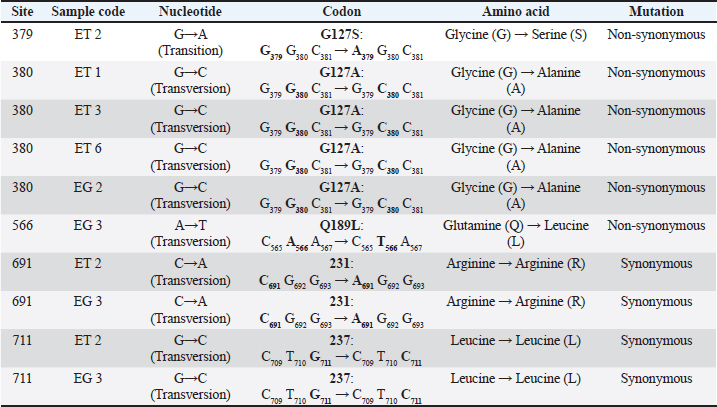 In the coding PRNP region of thin-tailed and fat- tailed sheep, we observed 10 nucleotide variations and 11 SNPs. Substitution of guanine nucleotides with adenine nucleotides (transition mutation) at site 379 in ET 2 resulted in a change of the amino acid of codon 127 from glycine to serine (G127S). A transversion mutation of guanine to cytosine nucleotide substitution at site 380 in ET 1, ET 3, ET 6, and EG 2 resulted in the homozygous haplotype codon G127A. There was a non-synonymous mutation at site 566 in EG 3 from the transversion mutation of nucleotide substitution, resulting in the homozygous haplotype codon Q189L. Four synonymous mutations at sites 691 and 711 in ET 2 and EG 3 were also observed. Details of the substitution mutations in ET and EG are shown in Table 1. Single-nucleotide polymorphisms at sites 380, 691, and 711 resulted in four non-synonymous and seven synonymous mutations in locations with strong or S (C & G), keto or K (T & G), pyrimidine or Y (C & T), and amino or M (A & C) nucleotides in ET and EG. Details of the SNPs in thin-tailed and fat-tailed sheep are shown in Table 2. A total of 10 non-synonymous and 11 synonymous mutations from nucleotide substitution and SNP were observed in ET and EG. There were six genotypic variations at codon 127 and two at codon 189. These are shown in Table 3 and Table 4. Interestingly, all samples had the A136L141R154Q171 scrapie codon.