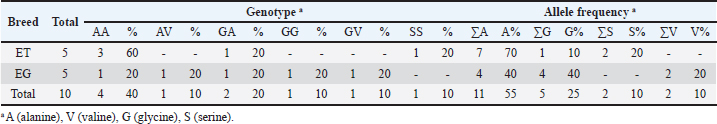 Table 3. PRNP genotype and allele frequencies in codon 127 of thin-tailed (ET) and fat-tailed (EG) Indonesian sheep.