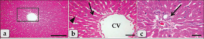Fig. 1. Photomicrographs of the liver of the G1; control group, (a) showing normal, intact hepatic parenchyma without any abnormalities. (b) Higher magnification of the inset box in fig. a showing intact hepatic parenchyma with normal hepatocytes of an irregular polygonal shaped cells with single, central spherical nucleus, and intact hepatic cords (arrow), intact hepatic sinusoids with intact lining epithelium (arrow head), intact central vein (CV) with normal lining epithelium. (c) showing normal and intact portal blood vessels (arrow) of portal triad. Staining: H&E. Scale bars: All=30 μm, except a=200 μm.
