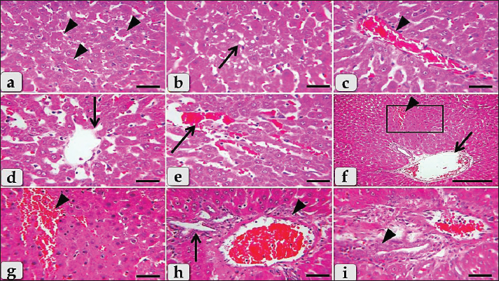Fig. 2. Photomicrographs of the liver of G2 (Diclofenac treated group), (a) Diffuse coagulative necrotic cells characterized by enlarged cells, hypereosinophilic cytoplasm with nuclear disappearance (arrowheads). (b) Showing diffuse hydropic degenerations (ballooning degeneration) characterized with formation of vacuoles of variable shapes and sizes within the hepatocytes cytoplasm with sever disorganization of the hepatic cords (arrow). (c) Showing severe dilatation and congestion of the central vein (arrow head). (d) Showing severe degenerative changes of the central vein lining epithelium (arrow). (e) Sever sinusoidal dilatation with congestions (arrow) accompanied with severe pressure atrophy of hepatic cords. (f) Showing severe hemorrhage; extravasated RBCs (arrowhead) in between hepatocytes beside sever portal blood vessels dilatation (arrow). (g) Higher magnification of the inset box in fig. f showing the wide area of hemorrhage (arrow head). (h) Showing severe dilatation and congestion of portal blood vessels (arrow head) with bile duct hyperplasia (arrow) accompanied with sever vacuolations of the ductal lining epithelium. (i) Showing severe inflammatory cells infiltrations of mainly lymphocytes surrounding blood vessels within the portal triad (arrow head). Staining: H&E. Scale bars: All=30 μm, except f=200 μm.