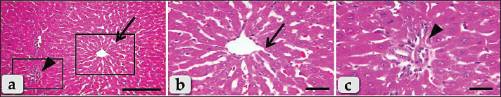 Fig. 3. Photomicrographs of the liver of G3 (Silymarin treated group), (a) showing normal, intact hepatic parenchyma without any abnormalities with normal central vein surrounded with intact hepatic rays (arrow) with normal intact blood vessels of portal triad (arrow head). (b and c) Higher magnification of the inset boxes in fig. a showing the same; intact hepatic parenchyma with normal and intact hepatic cords (arrow), intact central vein with normal lining epithelium of fig. b. and intact portal blood vessels (arrow head) of portal triad (fig. c). Staining: H&E. Scale bars: All=30 μm, except a=200 μm.