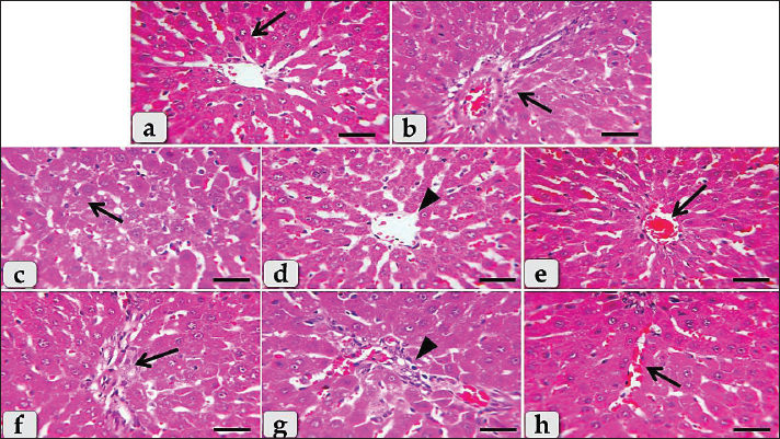 Fig. 4. Photomicrographs of the liver of G4 (Diclofenac plus Silymarin treated group), (a) showing normal, intact hepatic parenchyma with normal central vein surrounded with intact hepatic rays (arrow). (b) showing normal, intact blood vessels of portal triad (arrow). (c) Showing very few or individual coagulative necrotic cells within the hepatic parenchyma (arrow) with mild to moderate hydropic degenerative changes of hepatocytes. (d) Showing mild degenerative changes of the central vein lining epithelium (arrowhead) surrounded with normal organized hepatic rays. (e) Showing mild to moderate congestion of the central vein (arrow). (f) Showing mild inflammatory cells infiltrations of mainly lymphocytes in between the hepatocytes within the hepatic parenchyma (arrow). (g) Showing mild inflammatory cells infiltrations of mainly lymphocytes surrounding blood vessels within the portal triad (arrow head). (h) showing mild sinusoidal dilatation with congestions (arrow) accompanied with no any pressure atrophy of hepatic cords. Staining: H&E. Scale bars: All=30 μm. ConclusionWe conclude that silymarin has a significant hepatoprotective effect against diclofenac-induced liver toxicity in male Wistar rats through the neutralization and improvement of all histopathological injuries. AcknowledgmentThe author would like to thank the Deanship of Graduate Studies and Scientific Research at Qassim University, Saudi Arabia for financial support (QU-APC-2025). Conflict of interestNo competing interests. Data availabilityAll data generated during the current study are included in this manuscript. ReferencesAboubakr, M., Abdelkader, A., Habotta, O.A., Adel, N., Emam, M.A., Abdelhiee, E.Y., Shanab, O., Shoghy, K., Elnoury, H., Soliman, M.M. and Ibrahim, S.F. 2021. Cefepime and diclofenac sodium combined treatment-potentiated multiple organ injury: role of oxidative damage and disrupted lipid metabolism. J. Biochem. Mol. Toxicol. 35(12), e22929. Adeyemi, W.J. and Olayaki, L.A. 2018. Diclofenac–induced hepatotoxicity: low dose of omega-3 fatty acids have more protective effects. Toxicol. Rep. 5, 90–95. Alabi, Q.K. and Akomolafe, R.O., 2020. Kolaviron diminishes diclofenac-induced liver and kidney toxicity in wistar rats via suppressing inflammatory events, upregulating antioxidant defenses, and improving hematological indices. Dose-Response 18(1), 1559325819899256. Al-Dossari, M.H., Fadda, L.M., Attia, H.A., Hasan, I.H. and Mahmoud, A.M. 2020. Curcumin and selenium prevent lipopolysaccharide/diclofenac-induced liver injury by suppressing inflammation and oxidative stress. Biol. Trace Elem. Res. 196, 173–183. Aljuhani, N., Elkablawy, M.A., Elbadawy, H.M., Alahmadi, A.M., Aloufi, A.M., Farsi, S.H., Alhubayshi, B.S., Alhejaili, S.S., Alhejaili, J.M. and Abdel-Halim, O.B. 2019. Protective effects of Ajwa date extract against tissue damage induced by acute diclofenac toxicity. J. Taibah Univ. Med. Sci. 14(6), 553–559. Aydin, G., Gökãimen, A., ã–ncã, M., ãicek, E., Karahan, N. and Gökalp, O. 2003. Histopathologic changes in liver and renal tissues induced by different doses of diclofenac sodium in rats. Turk. J. Vet. Anim. Sci. 27(5), 1131–1140. Basist, P., Khan, M.U., Jan, B., Gaurav, Khan, M.A., Parveen, R. and Ahmad, S. 2022. Metabolite profiling and nephroprotective Potential of the Zea mays L. Silk Extract against Diclofenac-Induced Nephrotoxicity in Wistar Rats. ACS omega 7(41), 36519–36534. Boelsterli, U.A. 2013. Mechanisms underlying the hepatotoxicity of nonsteroidal antiinflammatory drugs. In: Kaplowitz N, DeLeve LD, eds. Drug-induced liver disease. 3rd ed. Amsterdam, Netherlands: Elsevier 343–367. Dillard, C.J. and German, J.B. 2000. Phytochemicals: Nutraceuticals and human health. J. Sci. Food Agric. 80, 1744–1756. Dykens, J.A. and Will, Y. 2007. The significance of mitochondrial toxicity testing in drug development. Drug Discov. Today 12(17–18), 777–785. El-Kot, S.M., Wanas, W., Hafez, A.M., Mahmoud, N.A., Tolba, A.M., Younis, A.H., Sayed, G.E. and Abdelwahab, H.E. 2023. Effect of silymarin on the relative gene expressions of some inflammatory cytokines in the liver of CCl4-intoxicated male rats. Sci. Rep. 13(1), 15245. Ertekin, T., Bilir, A., Aslan, E., Koca, B., Turamanlar, O., Ertekin, A. and Albay, S. 2019. The effect of diclofenac sodium on neural tube development in the early stage of chick embryos. Folia Morphol. 78(2), 307–313. Esmaeil, N., Anaraki, S.B., Gharagozloo, M. and Moayedi, B. 2017. Silymarin impacts on immune system as an immunomodulator: One key for many locks. Int. Immunopharmacol. 50, 194–201. Fattori, V., Borghi, S.M., Guazelli, C.F., Giroldo, A.C., Crespigio, J., Bussmann, A.J., Coelho-Silva, L., Ludwig, N.G., Mazzuco, T.L., Casagrande, R. and Verri Jr, W.A. 2017. Vinpocetine reduces diclofenac-induced acute kidney injury through inhibition of oxidative stress, apoptosis, cytokine production, and NF-κB activation in mice. Pharmacol. Res. 120, 10–22. Galati, G., Tafazoli, S., Sabzevari, O., Chan, T.S. and O’Brien, P.J. 2002. Idiosyncratic NSAID drug induced oxidative stress. Chem. Biol. Interact. 142(1–2), 25–41. García-Ramírez, M., Turch, M., Simã-Servat, O., Hernãndez, C. and Simã, R. 2018. Silymarin prevents diabetes-induced hyperpermeability in human retinal endothelial cells. Endocrinol. Diabetes Nutr. 65(4), 200–205. Gil, M.L., Ramirez, M.C., Terencio, M.C. and Castell, J. 1995. Immunochemical detection of protein adducts in cultured human hepatocytes exposed to diclofenac. Biochim. Biophys. Acta 1272(3), 140–146. Giridharan, R., Lavinya, U. and Sabina, E.P. 2017. Suppressive effect of Spirulina fusiformis on diclofenac-induced hepato-renal injury and gastrointestinal ulcer in Wistar albino rats: a biochemical and histological approach. Biomed. Pharmacother. 88, 11–18. Gãmez-Lechãn, M.J., Ponsoda, X., O’Connor, E., Donato, T., Castell, J.V. and Jover, R. 2003. Diclofenac induces apoptosis in hepatocytes by alteration