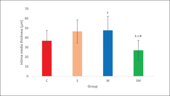 Fig. 1. Effect of sildenafil and metformin on IMT of PA. The result is presented as mean ± SD. ‡p=0.046 compared with control. §p=0.020 compared with control. ||p=0.001 compared with sildenafil. ¶p=0.001 compared with metformin. C=control; M=metformin; S=sildenafil; SM=sildenafil + metformin. DiscussionAlthough the pathobiology of PH remains unclear, its understanding has been revealed by dedicated research on this topic. Abnormalities can be observed in clinical, pathological, and biomolecular (Humbert et al., 2019). To establish diagnosis of PH, right heart catheterization procedure is a gold standard. Pulmonary arterial pressure more than 20 mm Hg is a confirmation of PH diagnosis (Humbert et al., 2023). With the advancement of PH, remodeling of the PA can become pronounced (Jia et al., 2023). Proinflammatory cytokine (TNF-α, IL-1, and IL-6), vasoconstrictor mediators (ET-1), and PASMCs or fibroblast proliferative agents (ET-1, ERK) are involved in this pathology (Scott et al., 2021; Guo et al., 2022; Alqarni et al., 2023; Guglielmi et al., 2025). Some drugs have been developed to inhibit PH progression in adults. However, in the pediatric population, the use of these drugs has become limited; only sildenafil and bosentan have been approved by the FDA and EMA (Wang et al., 2019; Avitabile et al., 2020). These two drugs when combined, theoretically, have a synergistic effect and will be a hope for those with unsatisfactory results who receive sildenafil for single therapy (BPD, CDH, and Down syndrome) (Beghetti et al., 2017; Cohen et al., 2019). Despite its promising results, the availability of bosentan remains a challenge, especially in Indonesia (Lilyasari et al., 2019). Known for its anti-endothelin, anti-inflammatory, and anti-smooth muscle proliferation properties, metformin is a substitute for bosentan (Yoshida et al., 2020).