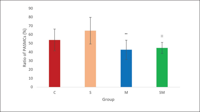 Fig. 2. Effect of sildenafil and metformin on PASMCs of PA. The result is presented as mean ± SD. **p=0.00064 compared to sildenafil. ||p=0.002 compared with sildenafil. C=control; M=metformin; S=sildenafil; SM=sildenafil + metformin.