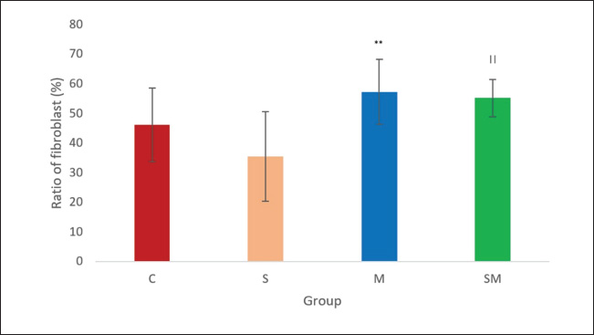 Fig. 3. Effects of sildenafil and metformin on fibroblast of PA. The result is presented as mean ± SD. **p=0.00064 compared to sildenafil. ||p=0.002 compared with sildenafil. C=control; M=metformin; S=sildenafil; SM=sildenafil + metformin.