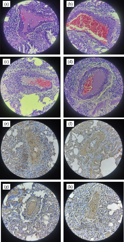 Fig. 5. Representative of PA histology. (a–d) IMT of each group on HE staining (a). control, (b). sildenafil, (c) metformin, (d) sildenafil plus metformin. (e-h) Ratio of PASMCs/fibroblast of each group on α-SMA staining: (e) control, (f) sildenafil, (g). metformin, and (h) sildenafil plus metformin. The PA smooth muscle cells were stained brown. We found a decrease in ET-1 levels in the treatment groups compared with the control group. These findings may inform us that mild–moderate PH, using a single drug, either sildenafil or metformin is enough when the target is to lower ET-1 levels. A previous study showed that sildenafil can reduce ET-1A type receptor and plasma ET-1 (Liu et al., 2007). In patients with PH, sildenafil reduces the ET-1 plasma concentration (Rossi et al., 2008). This substance is important in the progression of PH because it has both vasoconstrictive and proliferative actions (Yanagisawa et al., 1988; Chester and Yacoub, 2014; Barton and Yanagisawa, 2019). Its presence in circulation also reflects the severity of PAH in patients with HIV and congenital heart disease associated PAH (Parikh et al., 2016; Low et al., 2018). In patients with chronic thromboembolic PH, ET-1 elevation contributes to vasculopathy (Feriel et al., 2024). Metformin, in a previous study, was able to lower ET-1 levels (Yoshida et al., 2020). In the sildenafil plus metformin group, IMT was not linier to ET-1 concentration. The higher ET-1 concentration in this group compared with the other treatment groups, although not significantly, could be caused by upregulation expression of inducible and endothelial NO synthase by sildenafil (Salloum et al., 2003). An increase in NO will displace ET-1 from its receptor and cause an increase in ET-1 levels (Wiley and Davenport, 2001). The synergistic action of two drugs to other cytokines may explain IMT reduction (Kang et al., 2013; Ye et al., 2018; Ranchoux et al., 2019; Zych et al., 2019; Di Luigi et al., 2020; Vazifehkhah et al., 2020; Yoshida et al., 2020; Kniotek et al., 2021). This finding is a hope for pediatric patients with a higher risk of developing PAH, such as children with congenital heart disease, for better prognosis (Hansmann, 2017). Further research to prove the efficacy of combination of these two drugs in pediatric patients with PAH is valuable. A clinical study of metformin in adults with PAH showed positive results (improvement in right ventricular function and triglyceride contents) (Brittain et al., 2020). Our study has some limitations. The study used MCT to induce PAH in an animal model. Although it is widely used and has practicality, this approach does not perfectly mimic the pathobiology of PAH in humans. The sample size after mortality was adequate for statistical analysis. Although the more samples would describe the pathobiology better. AcknowledgmentsThe authors thank Anang Murdjito, Vet. Med and Azizah, Vet. Med for providing assistance during the research and Priangga Adi Wiratama, MD, Pathologist for histological analysis. Conflict of interestThere are no conflicts of interest to declare. FundingNo specific financial support was provided for this research. Authors’ contributionsAC, I, and MAR: developing concept and methodology. AC, MAR, and W: performing investigation. MAR and I: performing data curation. AC and MAR wrote the original draft. I and W are reviewing and editing drafts. All authors have reviewed and approved the final manuscript. Data availability All data supporting the findings of this study are available in the manuscript. ReferencesAgard, C., Rolli-Derkinderen, M., Dumas-de-La-Roque, E., Rio, M., Sagan, C., Savineau, J.P., Loirand, G. and Pacaud, P. 2009. Protective role of the antidiabetic drug metformin against chronic experimental pulmonary hypertension. Br. J. Pharmacol. 158(5), 1285–1294; doi:10.1111/j.1476-5381.2009.00445.x. Alqarni, A.A., Aldhahir, A.M., Alghamdi, S.A., Alqahtani, J.S., Siraj, R.A., Alwafi, H., AlGarni, A.A., Majrshi, M.S., Alshehri, S.M. and Pang, L. 2023. Role of prostanoids, nitric oxide and endothelin pathways in pulmonary hypertension due to COPD. Front. Med. 10, 1275684; doi:10.3389/fmed.2023.1275684. Avitabile, C.M., Vorhies, E.E. and Ivy, D.D. 2022. Drug treatment of pulmonary hypertension in children. Paediatr. Drugs 22(2), 123–147; doi:10.1007/s40272-019-00374-2. Barton, M. and Yanagisawa, M. 2019. Endothelin: 30 years from discovery to therapy. Hypertension 74(6), 1232–1265; doi:10.1161/HYPERTENSIONAHA.119.12105. Beghetti, M., Rudzinski, A. and Zhang, M. 2017. Efficacy and safety of oral sildenafil in children with down syndrome and pulmonary hypertension. BMC Cardiovasc. Disord. 17, 177; doi:10.1186/s12872-017-0569-3. Boucherat, O., Agrawal, V., Lawrie, A. and Bonnet, S. 2022. The latest in animal models of pulmonary hypertension and right ventricular failure. Circ. Res. 130(9), 1466–1486; doi:10.1161/CIRCRESAHA.121.319971. Brittain, E.L., Niswender, K., Agrawal, V., Chen, X., Fan, R., Pugh, M.E., Rice, T.W., Robbins, I.M., Song, H., Thompson, C., Ye, F., Yu, C., Zhu, H., West, J., Newman, J.H. and Hemnes, A.R. 2020. Mechanistic phase II clinical trial of metformin in pulmonary arterial hypertension. J. Am. Heart Assoc. 9(22), e018349; doi:10.1161/JAHA.120.018349. Chester, A.H. and Yacoub, M.H. 2014. The role of endothelin-1 in pulmonary arterial hypertension. Glob. Cardiol. Sci. Pract. 2014(2), 62–78; doi:10.5339/gcsp.2014.29. Cohen, J.L., Nees, S.N., Valencia, G.A., Rosenzweig, E.B. and Krishnan, U.S. 2019. Sildenafil use in children with pulmonary hypertension. J. Pediatr. 205, 29–34. doi:10.1016/j.jpeds.2018.09.067. Di Luigi, L., Sgro, P., Duranti, G., Sabatini, S., Caporosi, D., Del Galdo, F., Dimauro, I. and Antinozzi, C. 2020. Sildenafil reduces expression and release of IL-6 and IL-8 induced by reactive oxygen species in systemic sclerosis fibroblasts. Int. J. Mol. Sci. 21(9), 3161; doi:10.3390/ijms21093161. Feriel, B., Alessandra, C., Debor