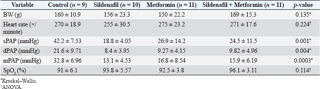 ABSTRACTBackground: Pulmonary hypertension (PH) is a progressive and potentially fatal condition if left untreated. Currently, only sildenafil and bosentan have been approved by the Food and Drug Administration for the medical treatment of pediatric patients. The availability of bosentan, in a developing country, such as Indonesia, is a challenge. Aim: To evaluate the effect of sildenafil and metformin on endothelin (ET)-1 levels in the progression of PH. Methods: Forty-eight, 12-week-old, male Wistar rats, weighing 117–193 g, were injected by monocrotaline (MCT) [60 mg/kg body weight (BW)] subcutaneously. The rats were then randomly assigned to four groups (control, sildenafil, metformin, and sildenafil plus metformin). One day after MCT injection, sildenafil (5 mg/kg BW) and metformin (100 mg/kg BW) were administered once daily for 21 days. Right heart catheterization was performed on day 22 after anesthesia with ketamine 50 mg/kg BW and xylazine 5 mg/kg BW intramuscularly. Blood was taken intracardially for approximately 3.5 ml, and the rats were euthanized. The serum was stored in −20° refrigerator before ELISA analysis. The lung was harvested and paraffin-blocked for later histology analysis. Blood serum was analyzed for ET-1, and a section of paraffin-blocked lung was stained with hematoxylin-eosin and α-smooth muscle actin. Intima media thickness (IMT) of 50–200 µm artery and ratio of pulmonary artery (PA) smooth muscle cells/fibroblast were analyzed. Results: The mean PA pressure (mPAP) and ET-1 of the treatment group were significantly lower than those of the control group. IMT was significantly lower in the sildenafil plus metformin group than in the other groups. Conclusion: Sildenafil and metformin alone or in combination improve mPAP and ET-1 levels. Sildenafil plus metformin prevents artery remodeling in the PH model. Keywords: Sildenafil; Metformin; Endothelin-1; Pulmonary; Hypertension. IntroductionPulmonary hypertension (PH), albeit rare its consequences, may lead to fatality when not well treated. It is defined as resting mean pulmonary arterial pressure (mPAP) of >20 mm Hg by right heart catheterization (Humbert et al., 2023). A study revealed its prevalence of 15–50 cases/million in adults and 2–16 cases/million in children. In the higher-risk groups, such as children with congenital heart disease, this number is higher (Hansmann, 2017). Nowadays, progression has been made in PH medical treatment (Guglielmi et al., 2025). However, for pediatric patients, only sildenafil (PDE-5 inhibitor) and bosentan (endothelin receptor antagonist) are approved by the Food and Drug Administration (FDA) and the European Medical Agency (EMA) (Wang et al., 2019; Avitabile et al., 2020). In developing countries, such as Indonesia, sildenafil is easier to obtain than bosentan. Sildenafil, as a single drug, has limitation in its clinical use for children with bronchopulmonary dysplasia (BPD), congenital diaphragmatic hernia (CDH), and Down syndrome. The survival rate and lowering of mPAP in these patients are still unsatisfactory (Beghetti et al., 2017; Cohen et al., 2019). Metformin is an alternative to bosentan which has similarity in its action to lower endothelin-1 (ET-1) (Yoshida et al., 2020). Endothelin is one of the important keys in development of PH (Alqarni et al., 2023). One of its substance, ET-1, is a potent and the strongest vasoconstrictor (Yanagisawa et al., 1988). It plays an important role in the pathobiology of PH, not only because of its vasoconstriction action but also because of its mitogenic properties (Barton and Yanagisawa, 2019; Chester and Yacoub, 2014). Research aims to understand ET-1 and its effect on PH is growing (Parikh et al., 2016; Low et al., 2018; Feriel et al., 2024). Sildenafil inhibits pulmonary artery (PA) remodeling by lowering ET-1A receptor and plasma ET-1 (Liu et al., 2007). Its anti-inflammatory effects are by decreasing proinflammatory cytokine (TNF-α, IL-6, and IFN- γ) and increasing anti-inflammatory cytokine (TGF-β and IL-10) (Zych et al., 2019; Di Luigi et al., 2020; Kniotek et al., 2021). Metformin decreases ET-1, IL-1, IL-6, TNF-α, and increasing IL-10 (Kang et al., 2013; Ye et al., 2018; Ranchoux et al., 2019; Vazifehkhah et al., 2020; Yoshida et al., 2020). The combination of these drugs may inhibit PH progression. This combination may result in further decreasing of ET-1. This study aimed to evaluate the effects of sildenafil and metformin treatment in a PH model focusing on histology profile and ET-1. Materials and MethodsStudy design and settingThis experimental study was conducted from April 2024 to June 2024 at the Animal Laboratory, Faculty of Veterinary Medicine, Universitas Airlangga, Surabaya, East Java, Indonesia. The study used Rattus norvegicus strain Wistar as the model for PH disease. After inducing the model using monocrotaline (MCT), the rats were randomly assigned to 4 groups (control, sildenafil, metformin, and sildenafil + metformin). One day later, the rats were treated for 21 days. On the 22nd day, right heart catheterization was performed, and the rats were euthanized. Animal preparation and samplingRattus norvegicus strain Wistar was obtained from PT Riset, AIRC, Indonesia. The minimum sample calculation for this study was nine per group. To anticipate 20% dropout, the animal requirement was 12 rats per group. Animal eligibility and randomizationHealthy, 12-week-old, male Wistar rats with a range of body weight (BW) 117–193 g were included in the study. Rats that died during the study were excluded from the analysis. After MCT injection, the rats were assigned to four groups by simple random allocation. Each group was differed by symbols (C for control, S for sildenafil, M for metformin, and SM for sildenafil + metformin). Animal acclimatization and housingRats were acclimatized for 7 days before the intervention. The rats were roomed under standard conditions (24°C room temperature, 50%–70