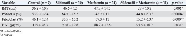 Open Vet. J.. 2025; 15(7): 3087-3096 Open Veterinary Journal, (2025), Vol. 15(7): 3087-3096 Research Article Effects of sildenafil and metformin on endothelin-1 in the progression of pulmonary hypertensionAgus Cahyono1,2, Irwanto3*, Mahrus Abdur Rahman3 and Widjiati Widjiati41Doctoral Program of Medical Science, Faculty of Medicine, Universitas Airlangga, Surabaya, Indonesia 2Department of Clinical Medicine, Faculty of Medicine, Universitas Surabaya, Surabaya, Indonesia 3Department of Child Health, Faculty of Medicine, Universitas Airlangga, Surabaya, Indonesia 4Department of Veterinary Science, Faculty of Veterinary Medicine, Universitas Airlangga, Surabaya, Indonesia *Corresponding Author: Irwanto. Department of Child Health, Faculty of Medicine, Universitas Airlangga, Surabaya, Indonesia. Email: irwanto [at] fk.unair.ac.id Submitted: 12/03/2025 Revised: 16/06/2025 Accepted: 18/06/2025 Published: 31/07/2025 © 2025 Open Veterinary Journal