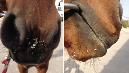 In April and May 2017, four Arabian horses (two stallions and two mares), aged between 2 and 4 years and weighing between 320 and 410 kg, were presented to the Veterinary Teaching Hospital at the College of Veterinary Medicine, King Faisal University. The horses exhibited multiple raised, verrucous epidermis-like proliferations around the muzzle and lips. These skin lesions, ranging in size from 2 to 8 mm, were neither pruritic nor painful. All horses were in good physical condition, with normal heart and respiratory rates and blood profiles. According to the owners, the lesions had developed over a period of 2 months, and the horses were not receiving any treatment at the time of presentation.