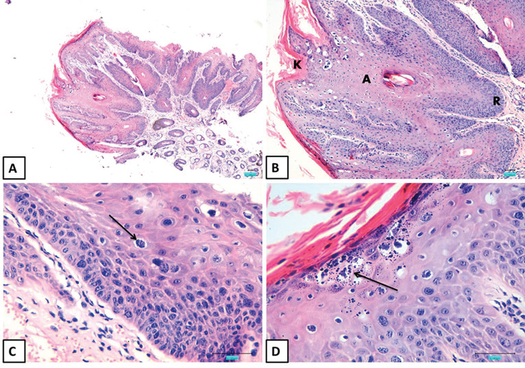 Fig. 2. H&E-stained sections of equine skin mass (bar=50 μm). (A) The exophytic mass is located on the skin surface. (B) The mass consists of proliferating keratinocytes, featuring elongation of the rete ridges (R), acanthosis (A), and hyperkeratosis (K). (C) Koilocytes are multifocally present within the epidermis (arrow). (D) Keratohyaline granules within the stratum granulosum are abundant and exhibit variability in size and shape (arrow).
