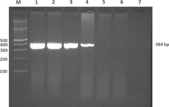 Fig. 3. Ethidium-bromide–stained agarose gel electrophoresis of PCR-amplified EcPV-1 DNA. Lane M: Molecular weight markers (bp); Lanes 1–4: Four suspected EcPV-1 cutaneous samples showing positive amplification; Lanes 5–6: Two normal cutaneous equine samples with no amplification; Lane 7: Non-template control (negative control) showing no amplification.