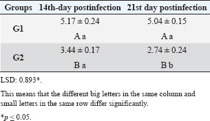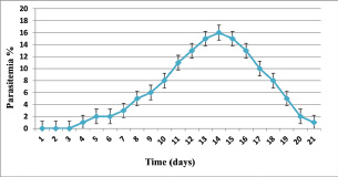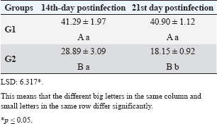 Fig. 3. Relationship between time (days) and Parasitemia (%) in T. annulata. Table 1. Effect of rabbit groups and period in the result of IFN-γ (pg/ml).