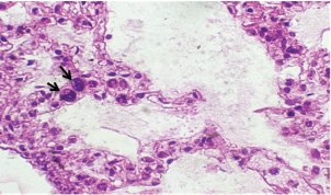 Fig. 4. A histopathological section of lung of (G2) at 14 days postinfection showing moderate thickening of alveolar tissue with presence number of developed schizonts accompanied by alveolar hyperemia (H&E stain X 40).