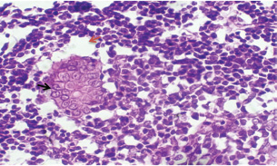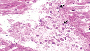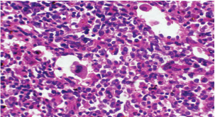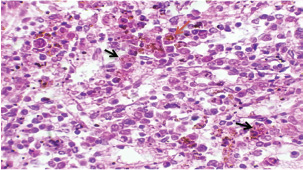 Fig. 13. A histopathological section of the mesenteric lymph node of (G2) at 21 days postinfection showing a lymphoid follicle containing numbers of abnormal plasma cells and macrophages within necrotic foci (H&E stain X 40). DiscussionThe various forms of T. annulata were described by Abd Elsayed et al. (2024). There is a close relationship between theileriosis and the change in rabbits’ temperature. The stage of parasite development plays a major role in this change, and this is consistent with (Ramzan et al., 2022), who noted a significant positive correlation between rising body temperature and increasing parasitemia levels, with both parameters peaking simultaneously at day 14 post-infection. This temporal association suggests that the febrile response represents a host immune reaction to active parasite proliferation in peripheral blood. Researchers have demonstrated a strong correlation between the incremental rise in parasite prevalence in the blood and the corresponding increases in body temperature and mortality rates in calves (Sandhu et al., 1998). Our findings agree with (Onzere et al., 2024) in demonstrating that the highest rate of parasitemia in T. equi occurred at 14 days postinfection in horses. Our findings agree with Razmi et al. (2019) regarding the important role of pro-inflammatory cytokines, particularly IFN-γ, in the immunological response to T. annulata, with increased levels possibly associated with symptoms including fever and anemia. Similarly, Tümer and Kızıl (2023) reported a significant serum levels of IFN-γ were elevated in T. annulata-infected cattle compared with healthy cattle. The reduced IL-10 levels in T. annulata-infected rabbits than in uninfected controls may be attributed to the altered immune dynamics induced by the infection. As noted by Sudan and Paliwal (2024), proinflammatory cytokines can directly suppress IL-10 production by affecting its main sources, such as monocytes, dendritic cells, macrophages, and regulatory T cells. This imbalance may also reflect a parasite-driven strategy to evade host immune regulation. Plasmodium, like Theileria, is an apicomplexan protozoan parasite. Abosalif et al. (2023) highlighted that Plasmodium falciparum can downregulate IL-10 production in dendritic cells and macrophages while promoting the release of proinflammatory cytokines such as TNF-α and IFN-γ. The suppression of IL-10 may represent a parasite-driven strategy to evade host immune regulation. The reduction in serum TGF-β1 levels noted at the 14th and 21st days postinfection with T. annulata may be related to a more extensive cytokine network, resulting in alterations in the synthesis of many cytokines, including TGF-β1. For instance, elevated concentrations of proinflammatory cytokines such as IFN-γ or TNF-α may inhibit TGF-β1 production, while the parasite’s immune evasion mechanisms or the host’s attempts to manage the infection could result in diminished TGF-β1 levels. Our results agree with Abdel-Hamied et al. (2020), who noted a marked rise in MDA levels, coupled with an associated reduction in TAC, in the serum of animals afflicted by theileriosis; Also Al-Hosary et al. (2015) revealed that the MDA concentrations were significantly higher and TAC was significantly lower in infected cattle than in healthy ones. Oxidative stress was significantly altered, with a significant increase in TAC and an increase in MDA. Ryskeldina et al. (2024) demonstrated that T. annulata infection induces a humoral immune response characterized by the synthesis of IgG antibodies. Our findings agree with those reported by Abd-Elmaleck et al. (2015); the liver showed dilated sinusoids filled with macrophages and parasitized erythrocytes, and in the kidneys, infected erythrocytes were observed. The lungs of infected rats exhibited hyperemia and the presence of Theileria parasites. In addition, general structural alterations in the lungs were observed in the liver and kidneys. Babesia, like Theileria, is an intraerythrocytic protozoan parasite belonging to the phylum Apicomplexa (Sabbar and Aaiz, 2016), and our results are in agreement with those of Esmaeilnejad et al. (2018), who reported considerable histological alterations in Babesia bigemina-infected rats, including congested livers, hepatocyte cytoplasmic clearance, severe hydropic alterations, and dilated sinusoids with macrophages and parasitized erythrocytes, under the microscope. Extreme lymphoplasma cell infiltration was also present in the liver parenchyma. Liver macrophages were swollen and sometimes contained Babesia-parasitized erythrocytes. ConclusionThis study demonstrated the complexity of host-pathogen interactions and clarified the pathogenesis and immunological dynamics of T. annulata in nontraditional hosts. AcknowledgmentsThe authors extend gratitude to the heads of the veterinary hospitals and medical personnel for their assistance during sample collection. The authors extend their gratitude to the personnel of the parasitology departments of the Faculty of Veterinary Medicine, University of Baghdad, Iraq, for their collaboration and assistance during sample processing. Conflicts of interestThe authors declare no conflicts of interest. FindingThis research did not receive external funding. Authors’ contributionAll authors contributed equally. Data availabilityThe manuscript contains all data supporting this study’s findings, and no additional data sources are required. ReferencesAbd-Elmaleck, B.S., Abed, G.H. and Mandour, A.M. 2015. Histopathological and hematological changes in rat tissue after injected with Babesia and Theileria parasites. Int. J. Curr. Microbiol. App. Sci. 4(7), 260–275. Al-Rhman, L.Y., Al-Rubaii, H.M. and Zaid, N.W. 2009. Study the effect of ewe’s pregnancy stages on blood parasitemia of some protozoa infections (Theileria hirci and Anaplasma marginale) and total, differential of white blood cells counts. Iraqi J. Vet. 33(1), 10–18; doi:10.305