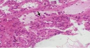Fig. 9. A histopathological section of lung of (G2) at 21 days postinfection showing moderate venus dilation and congestion with number of abnormal leukocytes (black arrow) (H&E stain X 40).