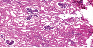 Fig. 12. A histopathological section of the kidney (G2) at 21 days postinfection showing evidence of an atrophic tuft of many glomeruli recorded with cystic dilation of adjacent tubules (H&E stain X10).