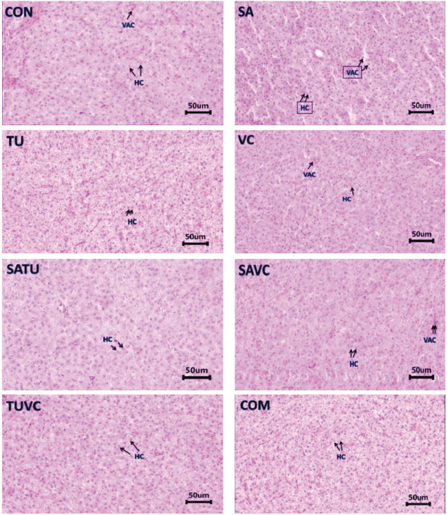 Fig. 1. Liver histology of experimental catfish. COM=experimental catfish supplemented with combination of katuk extract, turmeric powder, and vitamin C; CON=control experimental catfish without supplementation of katuk extract, turmeric powder, and vitamin C; HC=hepatocyte; SA=experimental catfish supplemented with katuk extract; SATU=experimental catfish supplemented with katuk extract and turmeric powder; SAVC=experimental catfish supplemented with katuk extract and vitamin C. TU=experimental catfish supplemented with turmeric powder; TUVC=experimental catfish supplemented with turmeric powder and vitamin C; VAC=vacuolized hepatocyte; VC=experimental catfish supplemented with vitamin C. Table 3. Liver SOD and blood SGPT and SGOT concentrations in experimental catfish supplemented with katuk leaf extract, turmeric powder, and vitamin C.