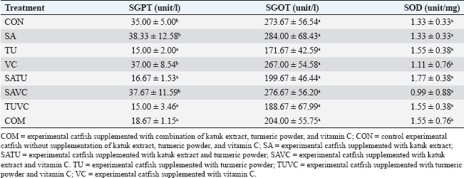 SOD, SGPT, and SGOT levelsThe results of observations of SOD, SGPT, and SGOT levels in experimental catfish supplemented with katuk extract, turmeric powder, and vitamin C for 8 weeks are presented in Table 3. The results of statistical analysis showed that the addition of katuk extract, turmeric powder, and vitamin C was not significantly different (p > 0.05) on SOD and SGOT levels but had a significant effect (p < 0.05) on SGPT levels. Adding turmeric powder to each treatment group reduced the plasma SGOT and SGPT levels of the catfish compared to the control group without turmeric powder supplementation. Based on the results of observations, the SOD value was found to be around 0.99–1.55 units/mg. The highest SOD levels were found in the treatment group with the addition of turmeric (TU) and the addition of TUVC at 1.55 units/mg, and the lowest was found in the treatment group with the addition of katuk extract and vitamin C (SAVC) at 0.99 units/mg. In the treatment group with the addition of turmeric powder, the SOD value was increased compared with that in the group without turmeric supplementation. SGPT levels ranged from 15.00 to 38.33 units/mg. The lowest SGPT levels were found in the treatment group with the addition of TU, and the addition of TUVC was 15.00 units/mg, and the highest was found in the treatment group with the addition of katuk extract (SA) at the level of 38.33 units/mg. Statistically, all treatment groups with the addition of turmeric powder were significantly different (p < 0.05) compared to those without turmeric powder supplementation. The control group was not statistically significantly different (p > 0.05) in all treatment groups without turmeric supplementation. Statistically, SGOT levels were not significantly different between the treatment groups, but they differed numerically. Based on these observations, the range of SGOT value is 171.67–284.00 units/mg. The lowest SGOT level in the treatment group with the addition of TU was 171.67 units/mg, and the highest was found in the treatment group with the addition of SA, that is, 284 units/mg. The SGOT levels were lower in each treatment group with the addition of turmeric than in the treatment group without turmeric powder. DiscussionThe HSI value is an indicator of the amount of energy reserves allocated for reproduction. The highest HSI value was found in the treatment group supplemented with katuk extract and turmeric powder in the feed (SATU), with an average of 1.13% compared with the other treatments. The HSI value tended to increase with each treatment; this is suspected to occur during vitellogenin synthesis. Fish liver contains high concentrations of estrogen receptors, which can synthesize large amounts of vitellogenin if stimulated by estrogen (Sumpter and Jobling, 1995). The increase in the HSI of catfish observed in this research can be applied to wild oviparous animals to support the reproduction process, to maintain a normal population, and biodiversity.