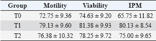 Table 3. Kacang buck spermatozoa motility, viability, and IPM (%) in egg yolk milk extender with or without EGCG after post-equilibration (5°C, 1 hour).