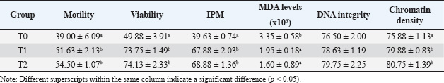 Quality of post-thawed spermatozoa of Kacang bucks according to the presence of EGCGMDA levels were decreased, and post-thawed spermatozoa quality was significantly (p < 0.05) improved when EGCG was introduced to the extender (T1 and T2) as opposed to when it was not (T0). Table 4 demonstrates that the optimal sperm viability, motility, DNA integrity, and IPM were obtained when EGCG was added at T2. This difference was significant for T0 (p < 0.05), but not for T1. Therefore, spermatozoa with the highest levels of viability, motility, IPM, and DNA integrity had the best quality (p < 0.05) when EGCG 100 mg/dl EGCG extender was added. Nevertheless, Table 4 shows that the chromatin density in groups T1 and T2 was not significantly different (p > 0.05), and both were higher (p < 0.05) than in T0. Additionally, EGCG-100 mg/dl supplemented extender media had the lowest MDA levels (p < 0.05) compared with T1 and T0 (Table 4). Statistical significance (p < 0.05) demonstrated that the addition of EGCG to the extender significantly increased total sperm motility following freezing. Both EGCG-based therapies (T1 and T2) demonstrated a total motility of more than 30%, which qualified them for AI. Table 2. The Kacang buck spermatozoa’s motility, viability, and percentage of intact plasma membrane (IPM) in egg yolk milk extender with or without EGCG at pre-equilibration (5°C).