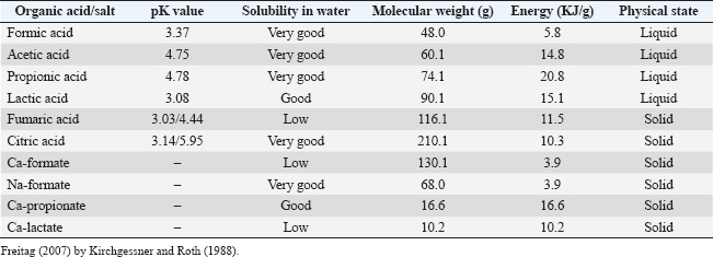 ABSTRACTThe poultry industry is continually exploring new feed additives to enhance poultry productivity and health. Since the European Union’s (EU) 2006 ban on antibiotics as growth promoters, alternative methods have become essential to support health and growth in livestock production. In response, various strategies have been developed to replace nutritional antibiotics, aiming to combat antibiotic resistance and manage diseases that would otherwise require antibiotic intervention. One promising alternative is the incorporation of organic acids (OAs) and their salts as feed additives in poultry farming. OAs improve feed palatability, reduce pH levels in the gastrointestinal tract of birds, activate digestive enzymes, and inhibit the growth of pathogenic microorganisms while preserving beneficial microflora. These acids enhance metabolism, improve feed digestibility, and accelerate growth. Additionally, OAs support overall bird health, a key factor affecting productivity traits and, consequently, the economic performance and profitability of poultry farming. This article examines the potential applications of OAs in poultry nutrition. Keywords: Antibiotic alternatives, Growth performance, Egg production, Organic acids. IntroductionIn 2006, the European Commission (EC) banned antibiotics as growth promoters in animal feed under EU Regulation No. 1831/2003, leading to declines in productivity and increased rates of certain animal diseases. This policy shift has driven researchers to investigate alternative non-therapeutic additives—such as organic acids (OAs), enzymes, probiotics, prebiotics, herbs, essential oils, and immunostimulants—to support health and productivity in poultry (Suresh et al., 2018; Lalev et al., 2020; Lalev et al., 2022a, b; Mincheva et al., 2022; Ivanova et al., 2022; Hristakieva et al., 2023; Akan et al., 2025). Among these, OAs are gaining attention as effective replacements, traditionally used as preservatives to extend shelf life in perishable foods (Coban, 2020; Braïek and Smaoui, 2021). OAs are weak acids containing a carboxylic acid group (R-COOH) and are intermediates in metabolizing carbohydrates, amino acids, and lipids. Commonly employed as antimicrobial additives in animal feed, these compounds include saturated straight-chain monocarboxylic acids and their derivatives (e.g., unsaturated, hydroxyl, phenolic, and multicarboxylic acids) and are often referred to as fatty acids, volatile fatty acids, or carboxylic acids (Cherrington et al., 1991). OAs are known for their antimicrobial efficacy against pathogenic bacteria, lowering GIT pH, thereby enhancing nutrient absorption and feed efficiency (Boling et al., 2000; Lesson et al., 2005; Kim et al., 2015). Their effectiveness as antimicrobials is primarily determined by their pKa values, which typically range between 3 and 5 (Freitag, 2007; Huyghebaert et al., 2011). Table 1 summarizes the properties of selected OAs and salts commonly used in poultry farming. OAs function as antimicrobials based on various physicochemical properties, including molecular weight, pKa, and minimum inhibitory concentration, along with factors such as the nature of the target microorganism and the buffering capacity of the feed (Dittoe et al., 2018; Coban, 2020). An acid’s pKa indicates its dissociation capacity, denoting the pH at which the acid exists equally in dissociated and undissociated forms. In the undissociated state, OAs can penetrate bacterial and fungal cell walls, altering microbial metabolism. Thus, their antimicrobial efficacy is enhanced in acidic environments like the stomach and reduced at neutral pH levels, as in the intestine. OAs with higher pKa values are typically weaker acids and more effective feed preservatives because they remain largely undissociated, effectively protecting feed from microbial spoilage. Conversely, acids with lower pKa values more readily dissociate, lowering gastric pH but having a limited antimicrobial impact in the intestine (Theobald, 2018). Table 1. Properties of some acids and salts used in poultry.