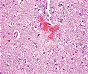 Fig. 2. Photomicrograph of the cerebrum of Arabic Gum-treated rat. Gray matter. Many amyloid plaques (black arrow) were observed in the affected gray matter, with the amyloid plaques as focal areas in approximately 50% of the gray matter area. Table 1. Means of amyloid to total area score (%).