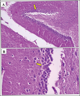 Fig. 3. Photomicrograph of the hippocampus of a Fenchol-treated rat. (A, B) Note the density of granule cells (yellow arrow) was lower in the negative control group than in the positive control group, likely due to neuronal loss in the dentate gyrus of the affected hippocampus. However, the number of granule cells was higher than that in the positive control and Arabic Gum groups. Also, mild neurodegeneration (black arrow) was observed in neurocyte of Cornu Ammonis region 2. H&E. A: 100x and B: 400x Analysis of interleukin-6 (IL-6) levels across the experimental groups revealed significant variations. In the negative control group, IL-6 levels remained within the normal physiological range, indicating the absence of inflammatory responses. In stark contrast, the positive control group exhibited a marked elevation in IL-6 levels, which was statistically significant (p < 0.05) compared to all other groups. This elevation correlates with the observed pathological changes, supporting the pro-inflammatory role of IL-6 in AlCl3-induced neuroinflammation.