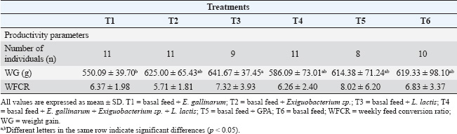 On the other hand, the crypts of Lieberkühn and their relationship with villi have been used as indicators to evaluate the effects of probiotics. Some probiotic strains can influence the stem cells located in these crypts, which are involved in the renewal of intestinal epithelial cells (Shaker and Rubin, 2010). This proliferation may be triggered by a high villus extrusion rate, immune factors, or inflammation caused by pathogenic microorganisms or toxins (Furlan et al., 2004; Rehman et al., 2007; Pearson and Brownlee, 2010). Our results indicate a trend toward crypt elongation or no differences compared with the control following the application of the probiotic strain. These findings are consistent with the absence of effects of administering the Biomodulator produced by Reinmark (E. hirae, L. reuteri, L. frumenti, L. johnsonii, S. thoraltensis, and B. pumilus) on crypt depth in guinea pigs (López, 2018). Additionally, reports not only from Moreno (2021) but also from Sopla (2024) indicate that adding a probiotic based on Bacillus amyloliquefaciens and Bacillus subtilis, respectively, increases crypt depth. However, other studies found a reduction in crypt depth after the application of the biomodulator commercialized by Reinmark (Carcelén, 2021). Furthermore, VH:CD ratio found in probiotic treatments was similar to or lower than that in the control treatment (T6). These findings align with López (2018), who found no differences between treatments, but differ from other studies showing a higher VH:CD ratio after applying the Biomodulator probiotic (Reinmark) in guinea pig diets (Puente et al., 2019; Carcelén et al., 2020). The impact of intestinal morphology on animal growth can be explained by the fact that a larger villi area implies a higher number of enterocytes and other epithelial cells. An increase in these cells can improve food digestibility and serve as an indicator of enhanced animal growth (Wang et al., 2019), as reported in fish (Hossain et al., 2022), poultry (Hashemitabar and Hosseinian, 2024), and pigs (Haupenthal et al., 2020). On the other hand, an increase in crypt depth is associated with cell proliferation for rapid villus renewal, but it can lead to high nutrient demand and lower growth efficiency (Hoste et al., 1988; Xu et al., 2003). However, if the crypt depth is high but the VH:CD ratio is also high, it would imply greater nutrient absorption (Xu et al., 2003). This result can be explained by the assumption of a high cell renewal rate combined with a reduced villus cell extrusion rate. In this study, the obtained results on production parameters align with intestinal villi and crypt measurements, as only a positive effect on jejunal villi height was found, which does not sufficiently contribute to improving guinea pig production parameters. Moreover, the use of probiotics in the diet promotes epithelial cell renewal without influencing villus growth, which may indicate animal stress or low levels of intestinal inflammation (Peuhkuri et al., 2010; Li et al., 2023). However, when GPA (T5) was used, similar findings were observed in villus growth due to minor or major changes in the microbiota caused by probiotics or antibiotics, which cannot be entirely attributed to stress or inflammation (Lobionda et al., 2019). The absence of the expected effects in this study after probiotic addition could be explained by the low colonization of these microorganisms in the intestinal tract. This may be due to the use of minimal probiotic concentrations in diet, as some studies report applying 108 (CFU)/mL or even higher doses to achieve an adequate response (Hadi et al., 2014; Nayel et al., 2019; Zhang et al., 2024). Additionally, since probiotics were administered orally, bacterial concentration may have been affected by low pH values in saliva and the stomach, making it difficult for a sufficient number of bacteria to reach the intestine. This issue can be overcome by adding complementary molecules to protect probiotic bacteria (Jumazhanova et al., 2023). Despite being native guinea pig bacteria, the intestinal microbiota of guinea pigs may present a challenging environment for the colonization of applied bacteria. Therefore, including prebiotics that support their growth could improve their effects, as reported in other studies (Carcelén et al., 2020). ConclusionIn conclusion, the application of probiotics based on E. gallinarum, Exiguobacterium sp., and L. lactis induced changes in the length and width of intestinal villi, as well as in the Lieberkühn crypts. However, these changes did not positively influence the improvement of productive parameters in guinea pigs. AcknowledgmentsThe authors would like to thank UNHEVAL for their support, along with the Kotosh Livestock Experimental Center, for the development of this project. They would also like to thank SENASA for collaborating with the preparation of the histological slides. Finally, they would like to thank UTC-Chile, UACH, and Incabiotec for their assistance in providing advice and analyzing the results. Conflict of interestThe authors declare that there is no conflict of interest. FundingThis research was supported by the Universidad Nacional Hermilio Valdizán, Perú, through the resolution N° 0003-2024-UNHEVAL-VRI. Authors’ contributionsAll authors participated in the drafting of the manuscript. JGV, MSA, FAP, and WRJ participated in the study design and conception. JGV, MSA, JCA, and CCM performed the tests and collected the required data. JGV, MSA FAC, MR, EM, and WRJ analyzed the collected data. All authors have revised and approved the final manuscript. Data availabilityAll data supporting the findings of this study are available in the manuscript. ReferencesAliakbarpour, H.R., Chamani, M., Rahimi., G., Sadeghi, A.A. and Qujeq, D. 2012. The Bacillus subtilis and lactic acid bacteria probiotics influences intestinal mucin gene expression, histomorphology and growth performance in broilers. AJAS. 25