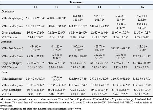 ABSTRACTBackground: Probiotics play an important role in improving host animal growth and influence intestinal morphology development. However, this effect varies depending on the type of probiotic used and the form of its administration. Aim: This study aimed to investigate the effect of probiotics based on native bacterial strains: Enterococcus gallinarum, Exiguobacterium sp., and Lactococcus lactis on the animal growth and intestinal histometry of guinea pigs (Cavia porcellus). Methods: Seventy-two weaned guinea pigs from a fattening line, with an initial average weight of 248.6 ± 42.2 g, were distributed into six pens. The subjects received oral administration of probiotics as follows: Treatment 1 (T1): E. gallinarum, Treatment 2 (T2): Exiguobacterium sp., Treatment 3 (T3): L. lactis, Treatment 4 (T4): a mixture of all three bacteria, Treatment 5 (T5): zinc bacitracin supplementation, and Treatment 6 (T6): control. After 63 days, weight gain and feed conversion ratio were determined. Additionally, the villus height and width, depth of crypt of Lieberkühn, and the villus height-to-crypt depth. (VH:CD) ratio in the duodenum, jejunum, and ileum were evaluated. Results: Probiotic application caused differences in weight gain (p=0.04), specifically between T1 and T3, but did not affect the weekly feed conversion ratio (p=0.72). On the other hand, intestinal histometry evaluations showed differences in villus height in each intestinal section (p < 0.05). In the jejunum, T4 had a greater villus height than the control (p < 0.05), whereas in the other treatments, probiotics did not increase height compared with the control. Differences were found in villus width in each intestinal section (p < 0.05) but were not greater than the width of the control. Treatments resulted in differences in crypt depth in all sections (p < 0.05), caused by an increase in depth compared with the control. Finally, VH:CD ratio also showed differences throughout the small intestine (p < 0.05), with values similar or lower in probiotics treatments compared with the control. Conclusions: The application of probiotics based on E. gallinarum, Exiguobacterium sp., and L. lactis did not affect the productive parameters of guinea pigs but had an impact on intestinal histomorphology. Keywords: Lieberkühn crypt, Duodenum, Jejunum, Ileum, Lactic acid bacteria. IntroductionThe guinea pig (Cavia porcellus) is a rodent used as a model for medical research or as a food source in some regions because its meat is highly valued for its taste and high nutritional content (Enríquez, 2019; Herrera et al., 2022; Aphrodita et al., 2024). However, the breeding of these animals is hindered by infectious diseases caused by Salmonella sp., Escherichia coli, Streptococcus sp., Klebsiella sp., and Bordetella sp. (Obregón et al., 2018; Angulo-Tisoc et al., 2021; Mendoza-Rodriguez, 2022). Many of these pathogens are ingested with food, reaching the intestine where they are absorbed and can cause severe infections. Several studies have focused on the intestines of these animals, which are divided into small and large intestines (Imam et al., 2021). The first section is mainly responsible for nutrient absorption, whereas the large intestine absorbs water and ions, (Kiela and Ghishan, 2016). The small intestine comprises three regions without clear divisions: the duodenum, jejunum, and ileum, with the jejunum having the longest and largest surface area (Mitjans and Ferrer, 2004). The intestine has a high density of villi and microvilli, increasing its absorption area (Walton et al., 2016). Additionally, the intestine contains Lieberkühn crypts, structures associated with villus renewal (Rehman et al., 2007). Beneficial and pathogenic bacteria colonize and interact with epithelial cells to regulate various physiological processes (Hill et al., 2017; Yang et al., 2020). Among the strategies used to control infections, antibiotics are widely employed to reduce pathogen effects. However, their use alters the intestinal microbiota and can leave residues in guinea pig meat and organs (Ampuero-Riega and Morales-Cauti, 2021). An alternative has been the use of probiotics isolated from the intestines or feces of guinea pigs (Goicochea-Vargas et al., 2024), as they can regulate gastrointestinal microbial populations and provide beneficial effects for the host (FAO/WHO, 2001). However, their efficacy depends on the food type, probiotic preparation before administration, dosage, and inoculation rate. Once in the intestinal tract, probiotics enhance the intestinal barrier against pathogens and strengthen the immune system for rapid infection prevention (Raheem et al., 2021; Fijan, 2023; Mousa et al., 2023). Additionally, these microorganisms produce beneficial molecules for the host and improve digestive enzyme activity, promoting intestinal growth (Zuo et al., 2019; Raheem et al., 2021; Wang et al., 2021). Moreover, probiotics can modify the size of intestinal villi and crypts, facilitating nutrient absorption (Kalita et al., 2021; Obianwuna et al., 2023). The application of mixed probiotics increased villus length and the villus height-to-crypt depth (VH:CD) ratio in broiler chickens (Awad et al., 2009; Aliakbarpour et al., 2012). In mice, probiotics based on Lactobacillus increased villus height and the VH:CD ratio (Li et al., 2021), similar to treatments with Bacillus coagulans, which increased villus height, crypt depth, and VH:CD ratio (Zhao et al., 2023). The addition of Lactobacillus delbrueckii to piglet diets reduced crypt depth and increased the VH:CD ratio (Wang et al., 2021). In guinea pigs, probiotics also affect intestinal morphology. The application of probiotics containing Enterococcus hirae, Lactobacillus reuteri, Lactobacillus frumenti, Lactobacillus johnsonii Streptococcus thoraltensis, and Bacillus pumilus increased the VH:CD ratio and reduced Lieberkühn crypt depth in the duodenum and ileum (Carcelén, 2021). Furthermore, using thi