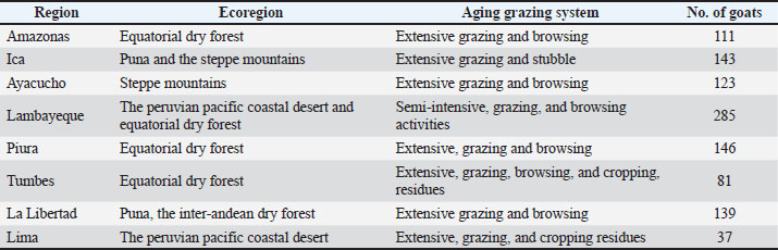 Research was conducted in collaboration with rural communities benefiting from the project “advancement of research services and technology transfer for the sustainable production of in Peru”, conducted by the National Institute of Agrarian Innovation. This project extended to eight regions where goat breeding predominated (Table 1). Technical management of these regions was limited, and most goat producers relied on traditional breeding methods.