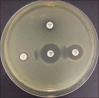Fig. 3. Double disc synergy test results for selected E. coli isolates from duck cloacal swabs collected in traditional markets in Surabaya, Indonesia. Table 4. Results of antibiotic sensitivity test, MDR, and ESBL.